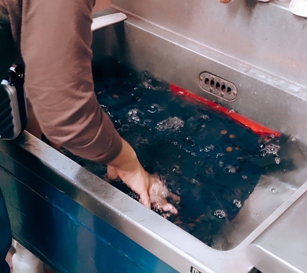 うちは水で、手洗いクリーニングです。一般的なドライクリーニング(水を使用せずに有機溶剤を用いて衣類を洗浄する方法)だと油汚れは落ちるけど、水溶性汚れは残ります。でも水洗いなら繊維の奥までしっかり落ちるんです。