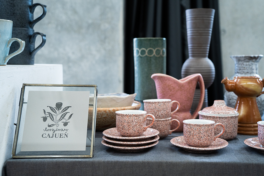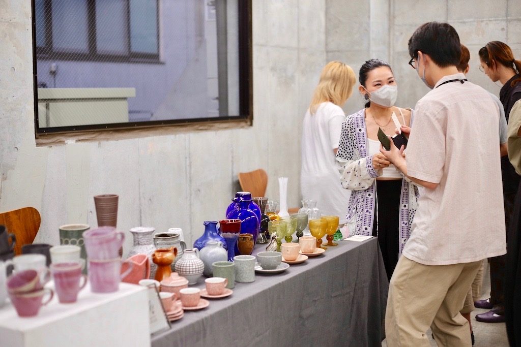 続いて、鮮やかな色合いのガラスや陶器が並ぶ『Imaginary Cajuen(イマジナリー カジュエン)』さんへ。文化、時代、地域を自由に跨いで蒐集した美しいインテリアアイテムを取り揃えるオンラインショップです。「昔からあるものに新たな価値を与えたい」と話す店主の金城さんがドイツやフランス、北米からバイイングしたデッドストックアイテムは今すぐに使いたくなるものばかり。個人的には伝統工芸の技法を用いて福岡の窯元で製作しているというオリジナルブランドmoody potteryのカップに一目惚れでした。