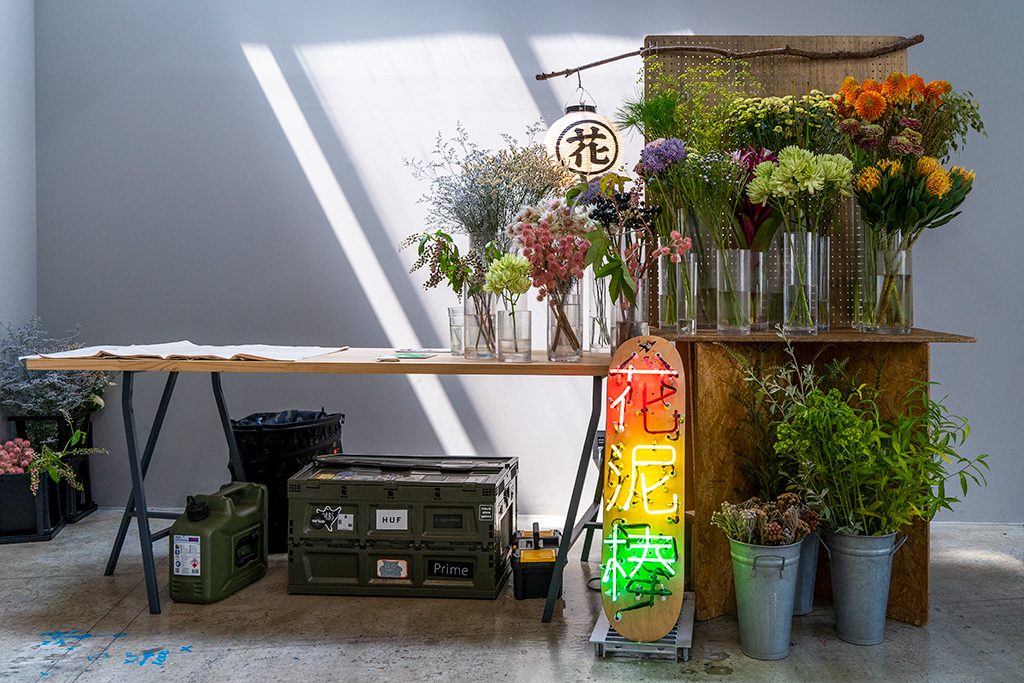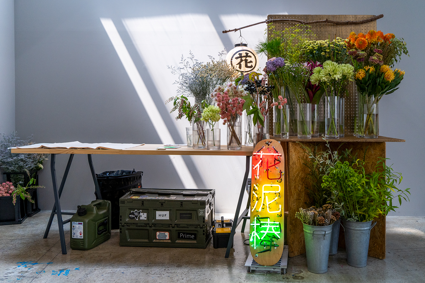 色とりどりの花が並ぶ『花泥棒』さんは、普段はストリートの花屋として活動中。 神出鬼没に深夜都内の路上で営業するスタイルということですが、今回はお花のほか、ドライフラワーのランプシェードやオリジナルアパレルグッズを持ってきてくれました。市場で働いていたこともあるという店主さん、花を買い付けるときのこだわりは新しい品種や珍しい品種をセレクトすること。「今日持ってきた花でいうと、南アフリカに自生するトリトマや高知県生まれのノーブルリリーは珍しいですね。このトリトマのオレンジ色はなかなかないんですよ」と教えてくれました。ドライフラワーのランプシェードも素敵すぎて、花泥棒さんのセンスに脱帽です。実は今から3年前、記念すべき第一回目の出没場所が実は代々木上原だったそう。今回イベントに参加したことは、花泥棒さんにとっての原点回帰のような感じにもなったと嬉しいお言葉をいただきました。