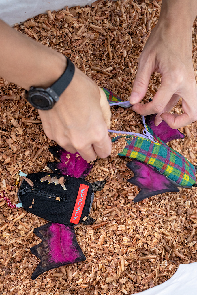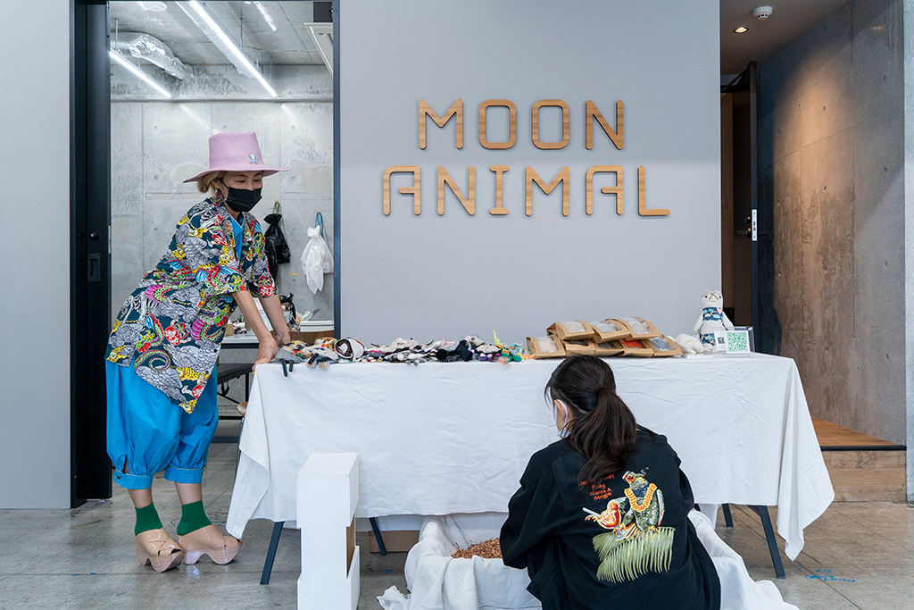 そして、2階の最後は大人気すぎてなかなか立ち寄れなかった『Moon Animal (ムーンアニマル)』さん。伐採時期を迎えた杉を活用しよう!というメッセージを伝えるため、ぬいぐるみとして2010年に誕生。おなかに杉のオガクズが入っているのでとってもいい香りのぬいぐるみなんです。今回のイベントでは、ぬいぐるみの販売のほか、杉チップを好きな人形に自分で詰めることができるプチワークショップを開催していました。サンプル商品のため1,000円というお得な価格もあって、子どもたちも飛びついていました。0歳と4歳の子どもがいる私も取材をそっちのけでネズミとリスのぬいぐるみを選び、せっせとオガクズを詰めてみました。(詰めても詰めても意外にパンパンにならないことに驚き)。リスはネックピローになるとのことでしたが、息子にプレゼントすると本当に気持ちいいみたいで毎日首に巻いて寝ています(笑)。