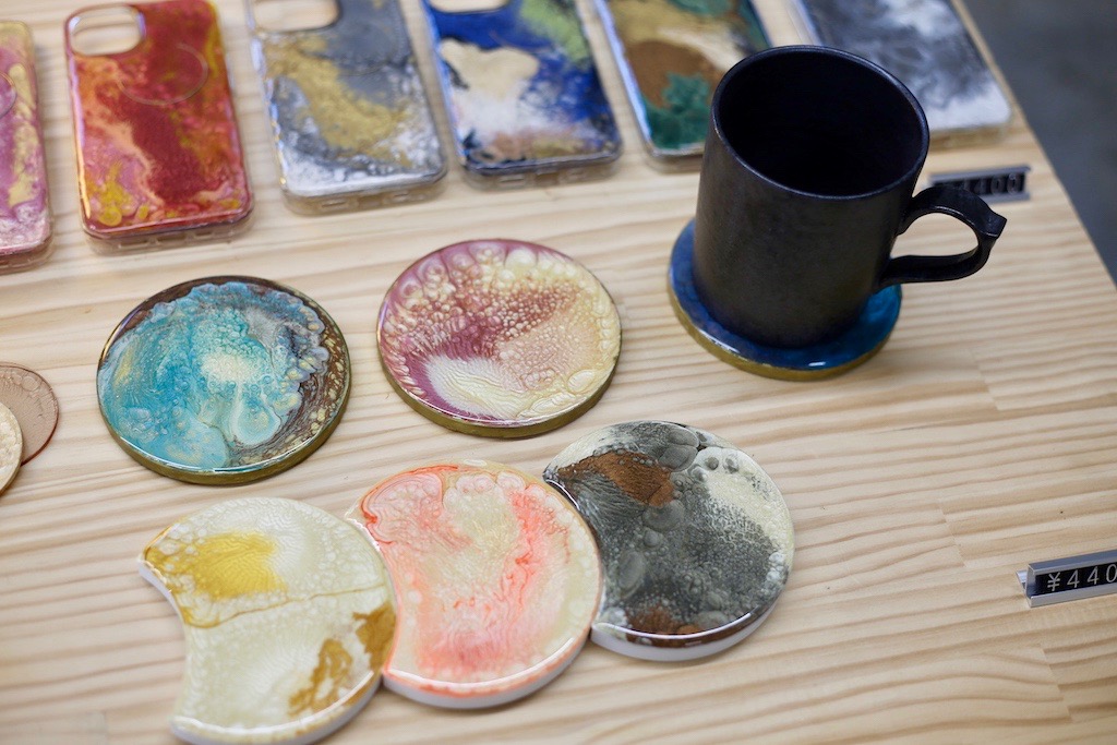 続いてお隣の『日常と月』さんへ。「日常」と「月」をコンセプトにひとつひとつ手作りの生活雑貨を販売しています。月の満ち欠けの形をしたコースターや、照明・iPhoneケースが美しく並ぶテーブルに思わず吸い込まれていきます。「今日はカラーチップから好きな色を選んでオーダーするiPhoneケースが人気でした。月の満ち欠けの形をした箸置きとヘアゴムはガチャガチャで。小さなお子さんにも喜んでもらえて嬉しかったです」。(土谷さん)。マイコースターもオーダーしてみたい!