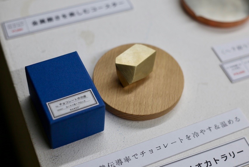「チョコレートの台座」、「子どもの名板」、「香りぐるま」。ちょっと変わったネーミングからそれぞれ使い方を想像するのが楽しいアイテムが並ぶ『86400″』さん。<暮らしの遊びを拡げる道具>をテーマに、家具や雑貨を開発・販売するデザインスタジオで、東京都の下町、荒川区にて職人さんと一緒にものづくりを行っています。ジャムやプリンなどのガラス瓶をリサイクルし、穴を開けた真鍮のプレートを置くだけでアーティスティックな一輪挿しになる「フラワースカーフ」はギフトに喜ばれそうだな〜と思いました。「『チョコレートの台座』は僕がいつもチョコレートを食べすぎちゃうので、一粒をとことん味わえるようなチョコレートのためのテーブルウェアを作りたいと思ったことがきっかけです」(山本さん)。これを冷蔵庫で冷やして使うのだとか!その他にもデザイン会社ならではの視点で生まれる遊び心やコンセプトが詰まった商品がたくさん並んでいて、ユニークさが際立つお店でした。