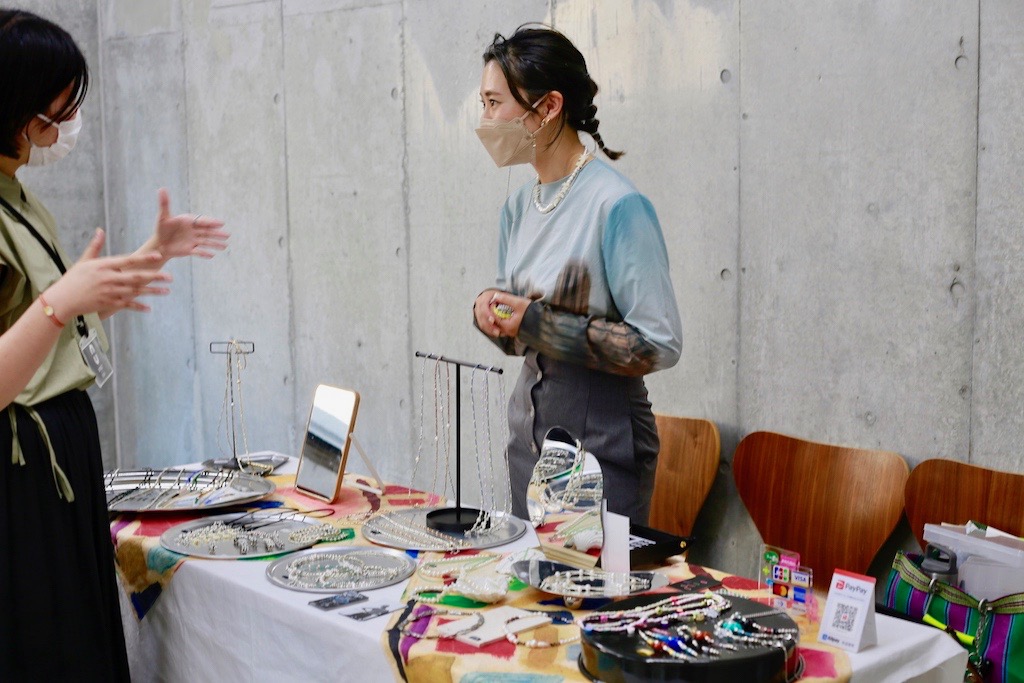 フロア一番奥の『CYACYAN』さんにお邪魔しました。季節感のある天然石やパール、ヴィンテージビーズを使ったネックレスやマスクチェーンをオンラインをメインに販売されているお店です。こんなおしゃれなマスクチェーンがあるなら憂鬱なマスクライフもちょっとウキウキしそうです。「パールや天然石など異素材の組み合わせで遊び心のあるアクセサリーを作っています。今日は30〜40代くらいのお客様がたくさん来てくださいました。一番人気はパールのアクセサリーでしたが、キッズ用に作ったクマのチェーンも意外に大人の方に好評。『ギャル味』があって可愛いと言ってくださって新たな発見がありました(笑)」(デザイナー斎藤さん)