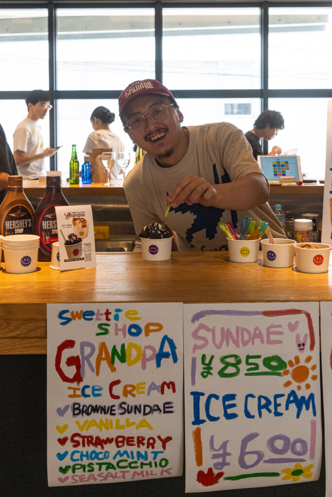 そのお隣で優しい笑顔で迎えてくれたのは、6月30日(日)に開催された「代々木上原映画館」にて、上映映画『シェフ 三ツ星フードトラック始めました』に登場するベニエを用意してくれ、ドーナツをはじめ季節のパイや焼き菓子など、様々なギルティーを提供するスウィーティーショップ「GRANDPA」さん。
