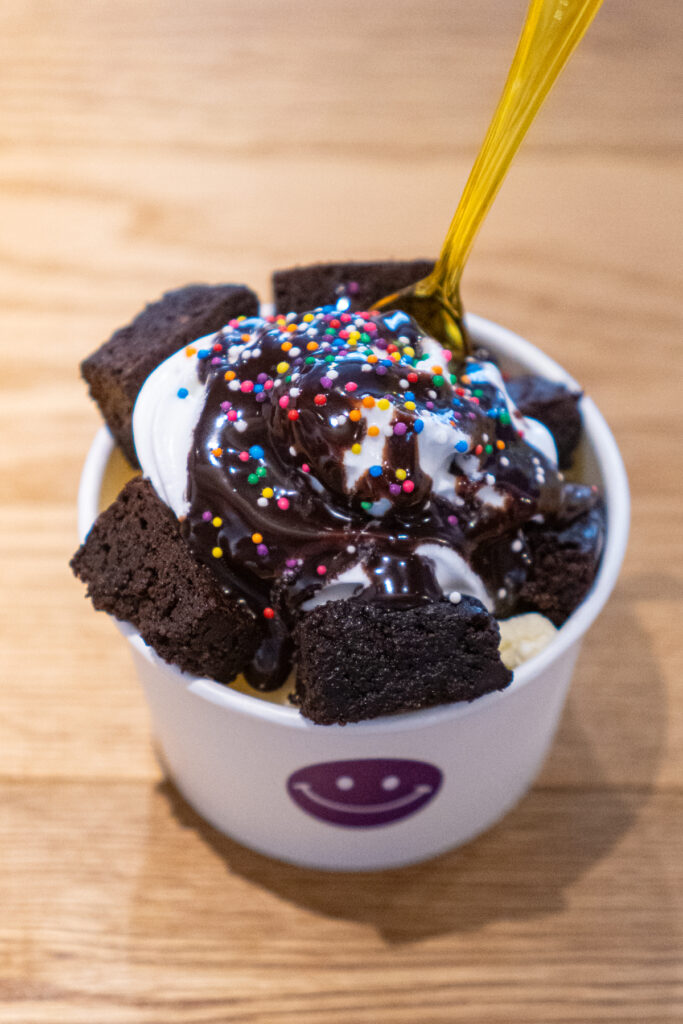 編集部スタッフが頂いたブラウニーサンデーは、お店のキャッチフレーズ通りギルティーな味わいで思わず笑顔になる美味しさ。スマイルマークが入ったカップにポップなカラースプレーがアメリカンでまた可愛い!お店に通い全種類制覇したくなりました。
