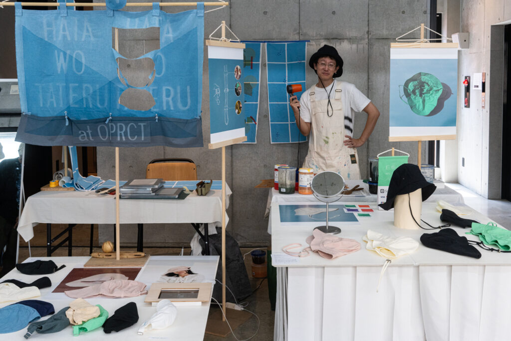 Space Rに入ると、期間限定で旗を立てオリジナルキャップを販売するプロジェクト「HATA WO TATERU」さんの大きなブルーの旗が待ち構えていました。水色のオリジナル注染の手拭いをベースに、自由にシルクを刷る事ができる手ぬぐいのシルクスクリーンワークショップに、生地や構造からデザインされたというキャップとハットが並び、プロジェクト発起人の木村さんと会話を楽しむお客様で賑わっていました!