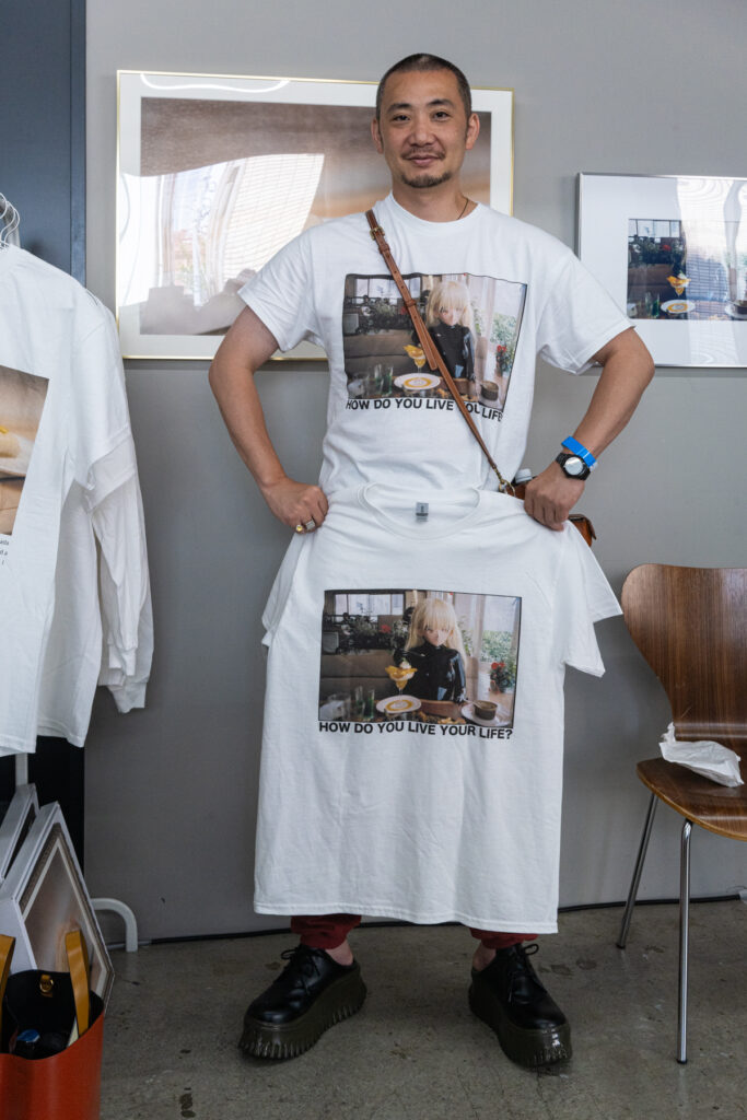 “HOW DO YOU LIVE YOUR LIFE?”の一文の上にプリントされている女性は実物のモデルさんで、当日は縁日会場にも駆けつけてくれていました。編集部スタッフも個性的なTシャツと作品誕生までの背景などを伺い、岩澤さんの世界観を存分に共有いただきました!