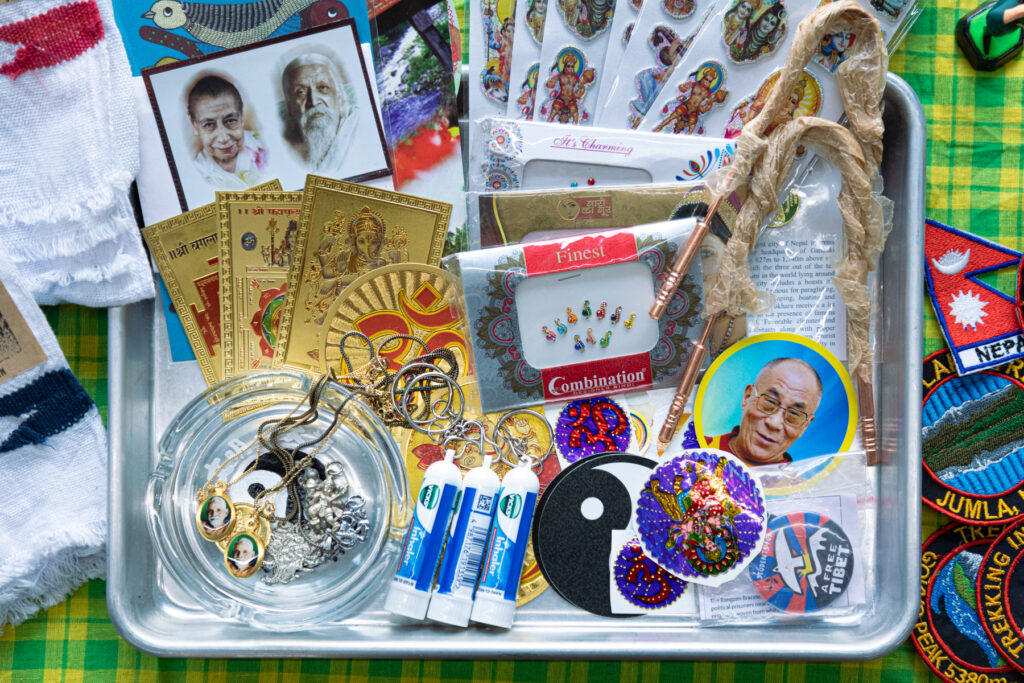 そんな店主の笑顔と一緒に、チェック柄のテーブル上には直近の旅先、ネパールで見つけた個性豊かなお土産たちがぎっしりと並んでいました。それぞれのお土産にはひとつひとつに旅の小話があり、カラフルな色使いに、ちょっとクセ強めなデザインやビジュアルは見ているだけでも本当に楽しい!