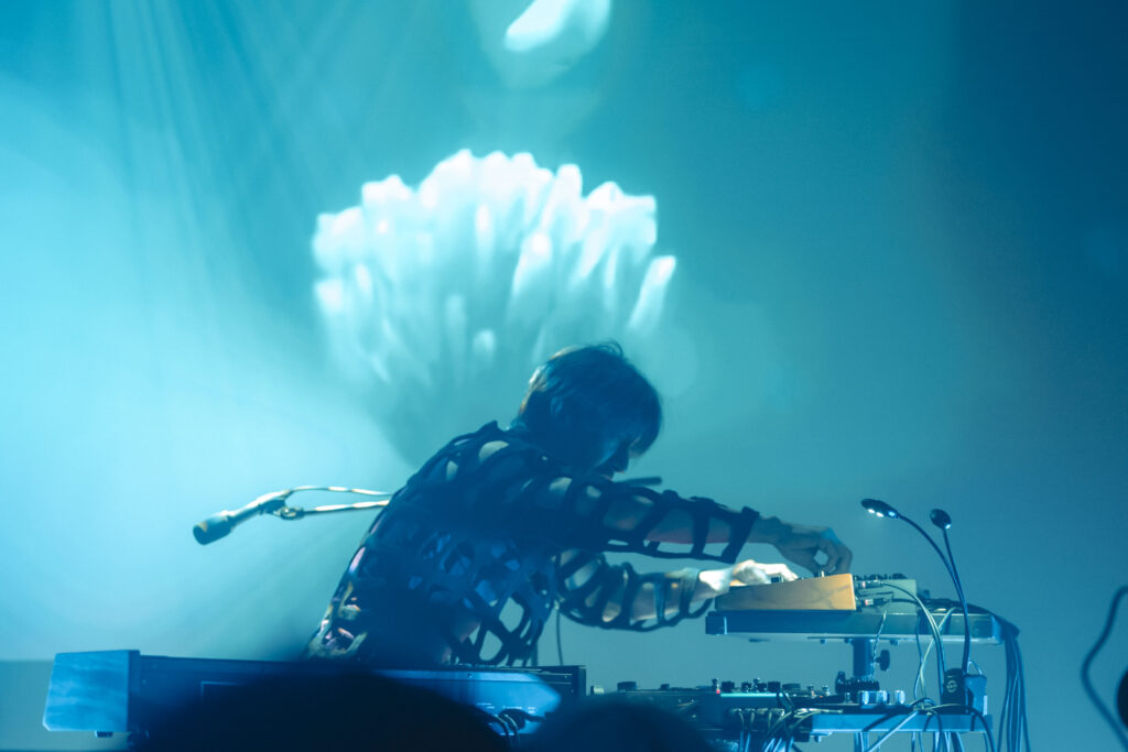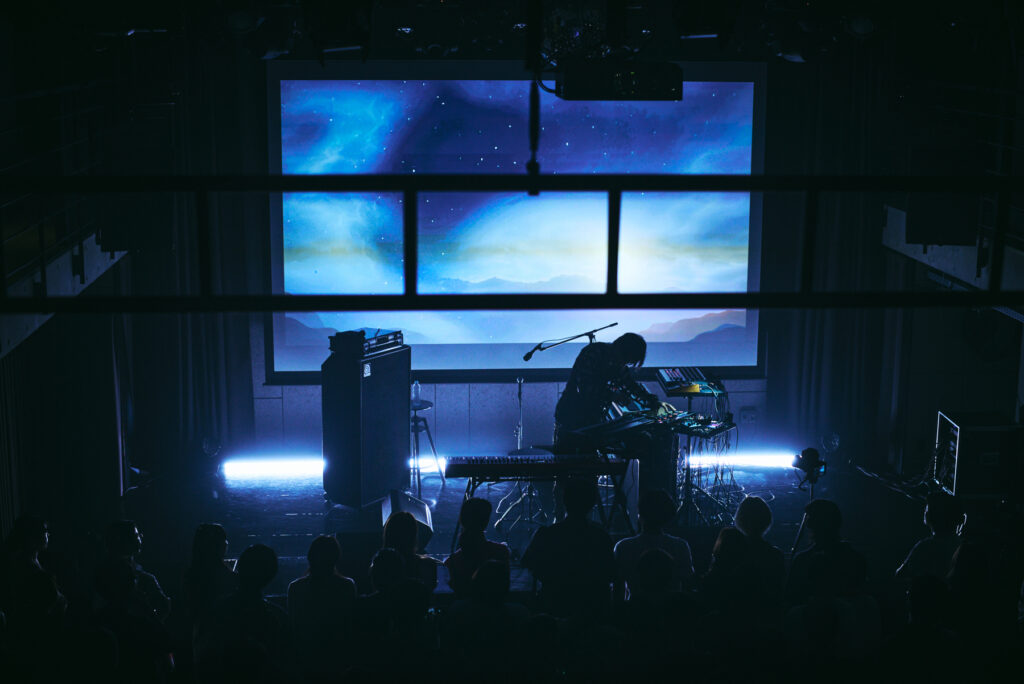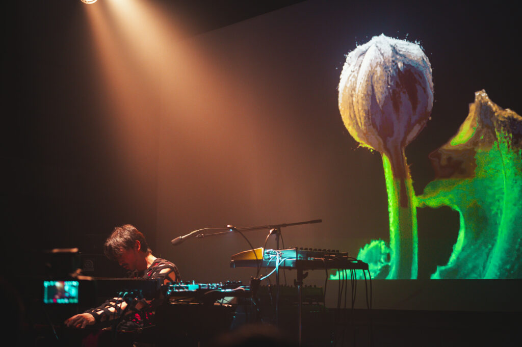 今回の公演では実験的な視覚表現も加わり、AIを通してステージ上で演奏するBIGYUKIさんを映した映像が、背後のスクリーンに投影されていました。演奏に合わせて次から次へと映し出されるアーティスティックな映像に、照明演出の相乗効果も加わり音楽への没入感、一体感を存分に味わうことができました。