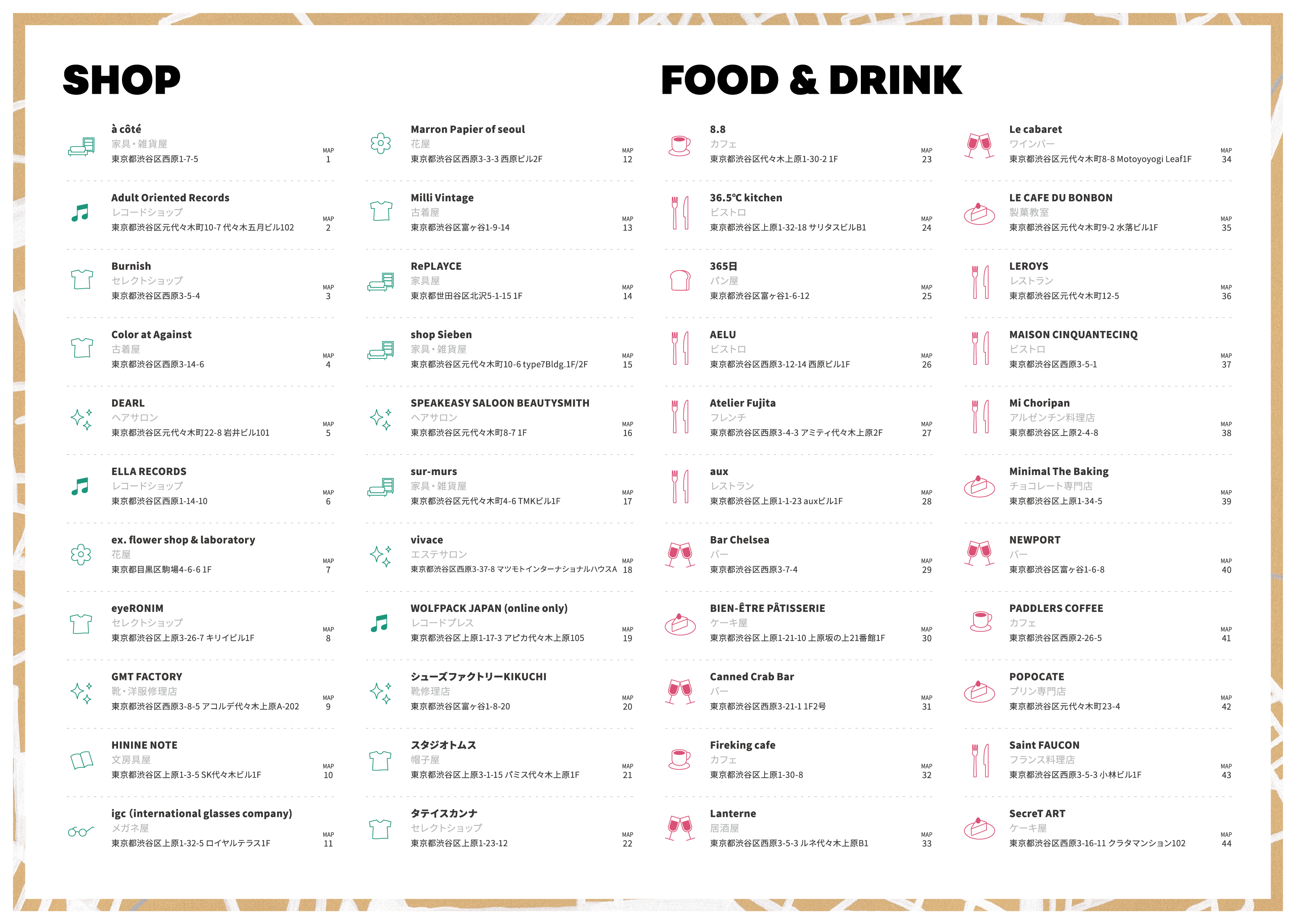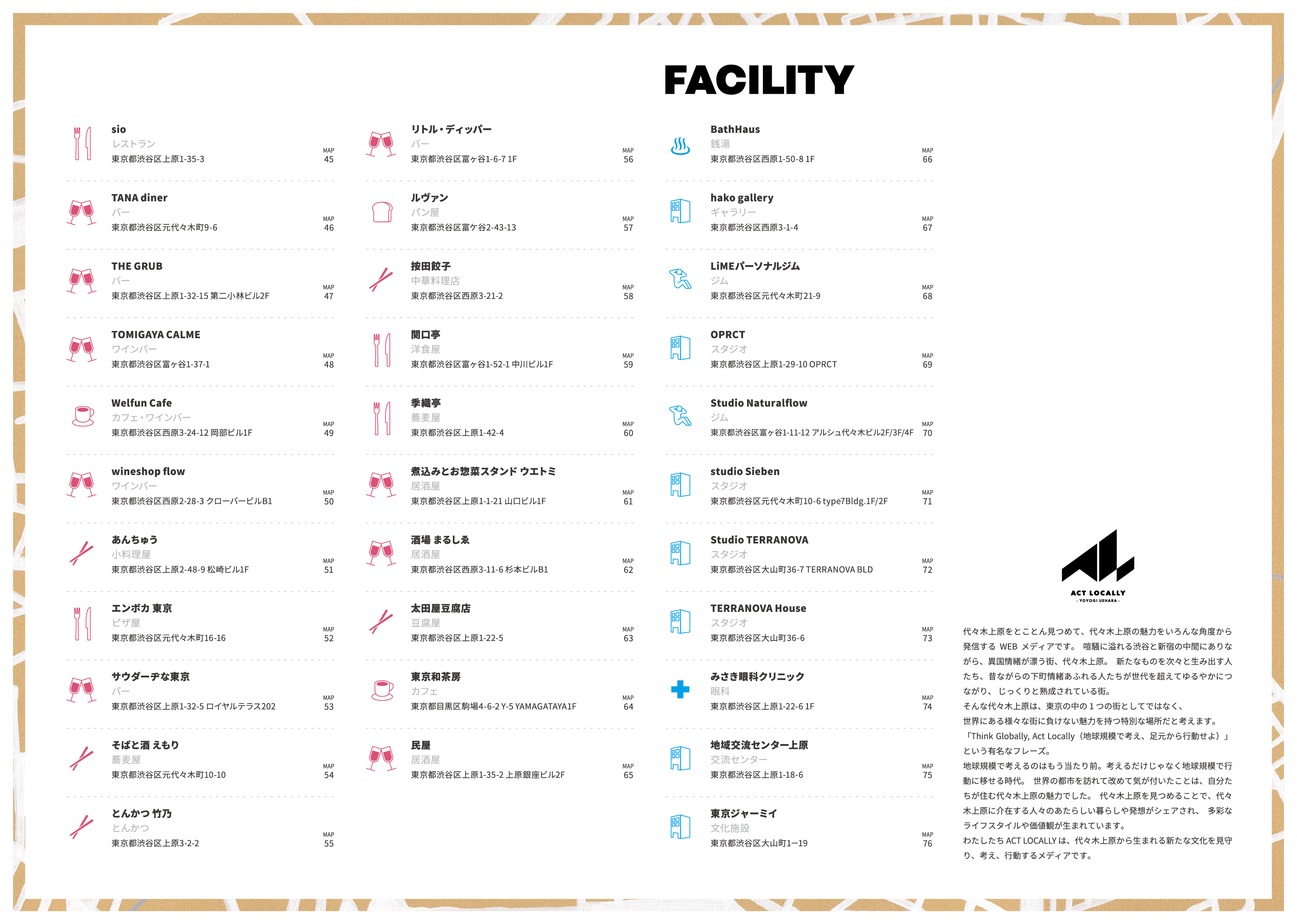 そしてイベント開催時に会場や代々木上原エリアで配布する予定だった「YOYOGIUEHARA MAP」。「リトル・ヨヨギウエハラ」に出店の皆さんはもちろん、これまでACT LOCALLYで取材した(9/25時点)店舗や企業を掲載したこのマップで、イベント終了後も代々木上原の街を楽しんでもらいたいという想いから作成されました。今回は特別にこのマップを公開したいと思います!
