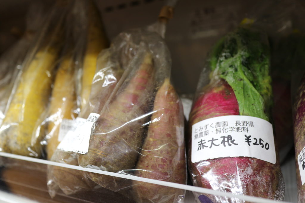 一般のスーパーでは手に入れることができない、自然農法でつくられた新鮮な野菜も。産地や農園の名前もしっかり明記されていて安心。