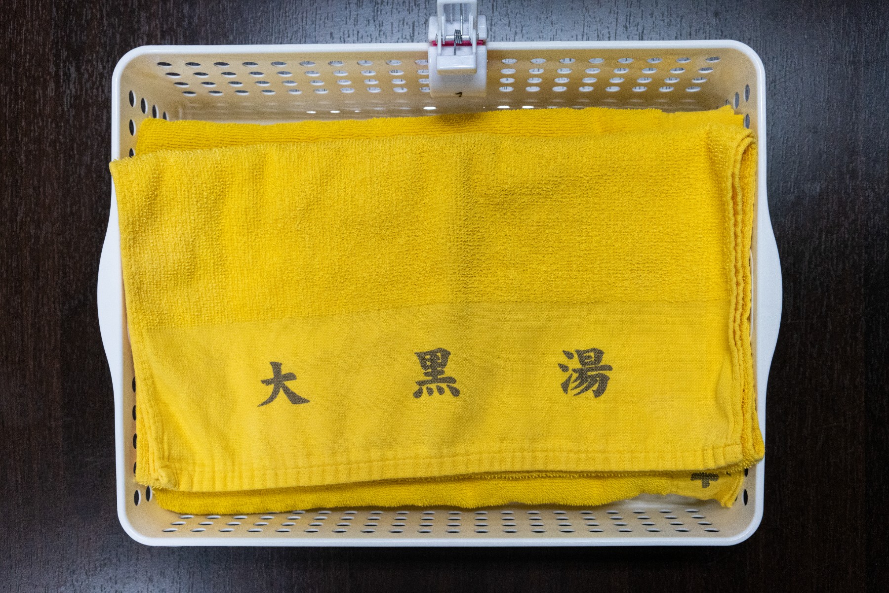 「当初、サウナのお客さんの目印は、腕や足に着けるバンドでした。でも、無くす人が多かったんです。なので、サウナ用のカゴに黄色いタオルを入れて、貸し出す方式を採用しました。このミニタオルが、いまではサウナのお客さんの目印になっています」