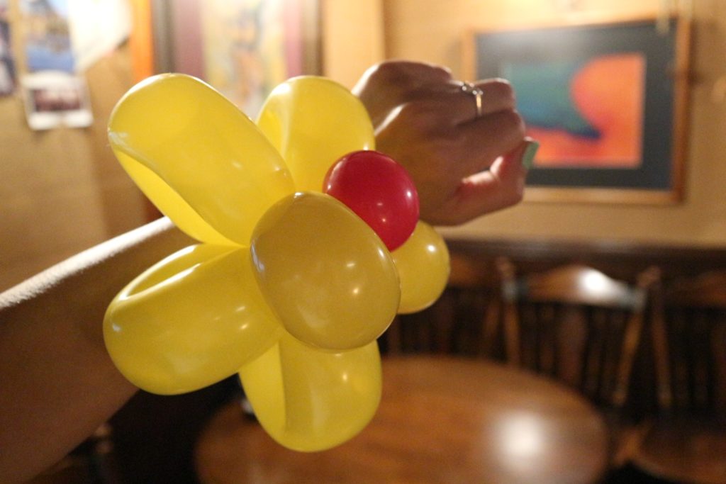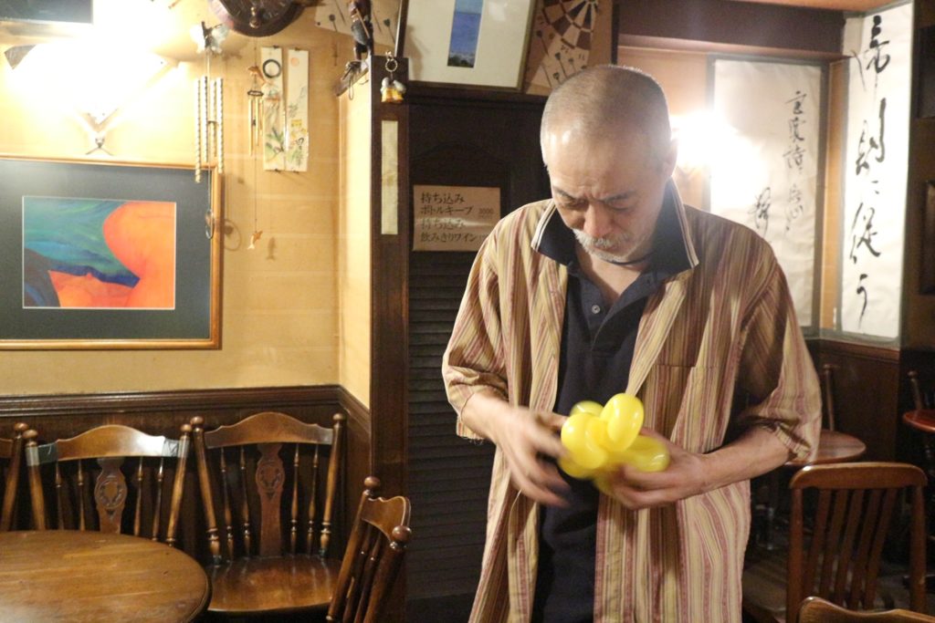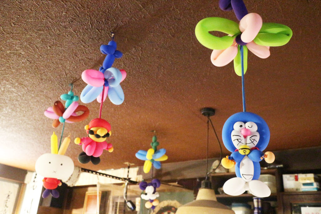 カウンター天井には、バルーンアートが吊るされていて、これがまたドラえもんやスーパーマリオなど完成度が高いこと。このバルーンアート達ももちろん小林さんが作ったもの。