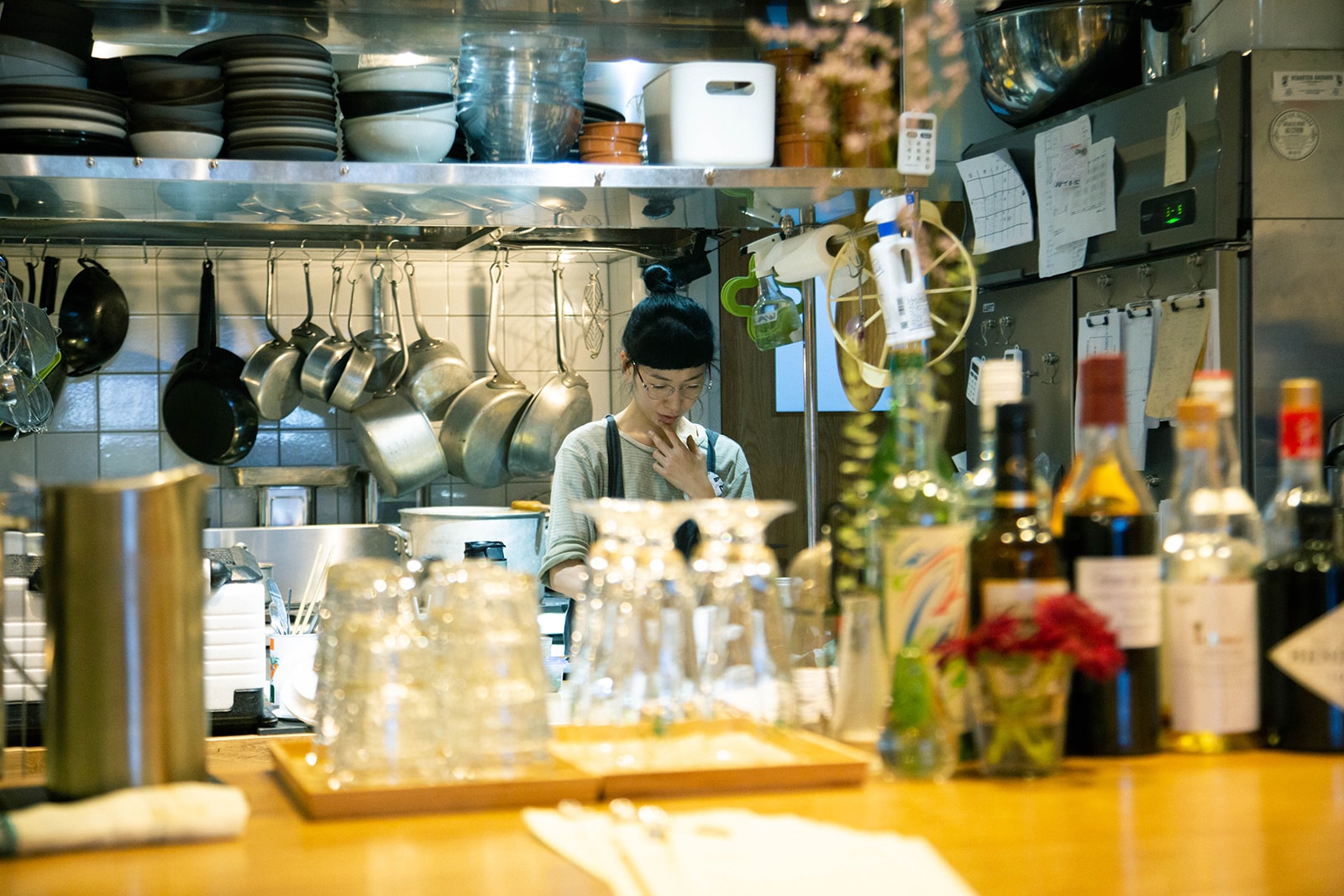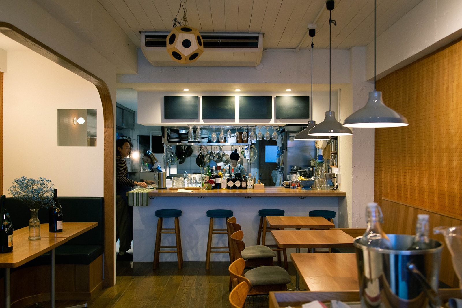 前は右奥にあったんですが、キッチンを広くしたかったので移動しました。お店を始めたのが2008年なんですけど、ほぼ居抜きで、少し内装を整えた状態で営業していたんですよ。だけどこれから更に10年やっていこうと思ったら、もっと料理もちゃんと出せるようにしたいし、設備も整えたほうがいいということになって、思い切ってリニューアルしました。