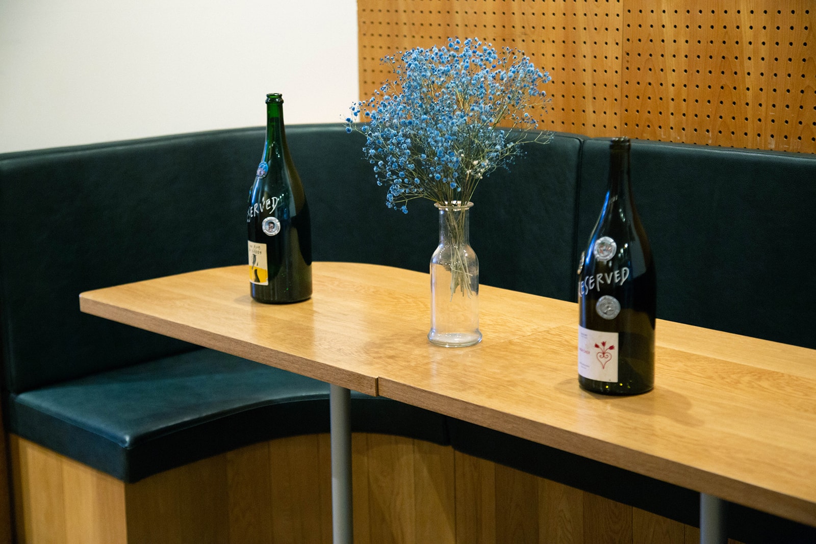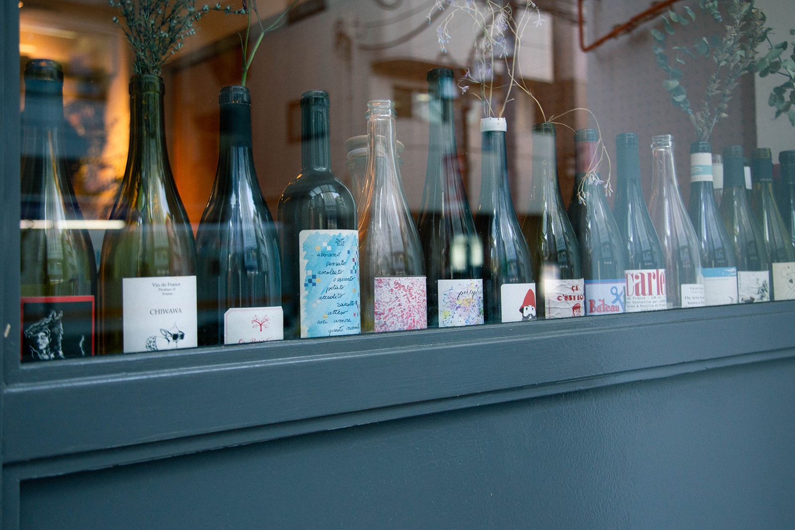 味同様、個性豊かなラベルのワイン。空いたボトルは店内でインテリアとして使用