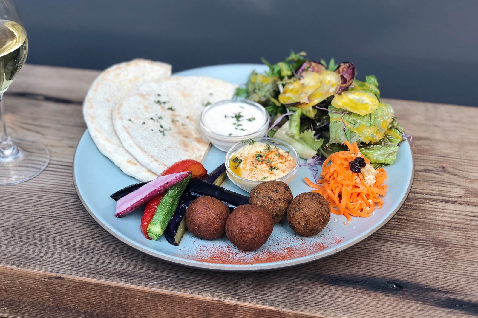 ランチタイムとディナータイムで食べられるファラフェルプレート。ピタパン、ラペ、サラダ、フムスなど野菜の味わいと彩りが豊か