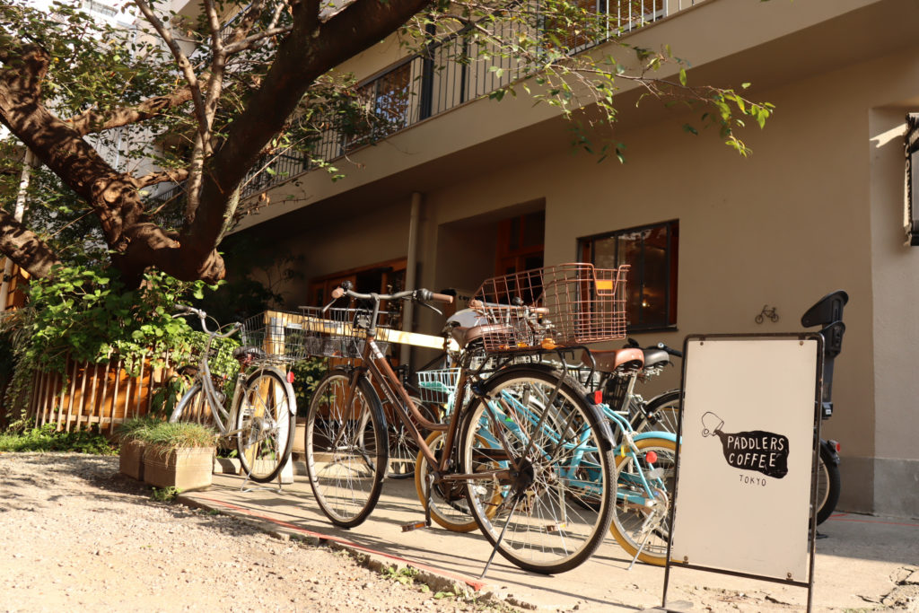 大きな桜の下に沢山のママチャリが停まっていてどこか生活感がある佇まいと、ウッディでお洒落な外国の雰囲気漂う空間が絶妙にマッチしている、コーヒーショップ「PADDLERS COFFEE(パドラーズコーヒー)」があります。