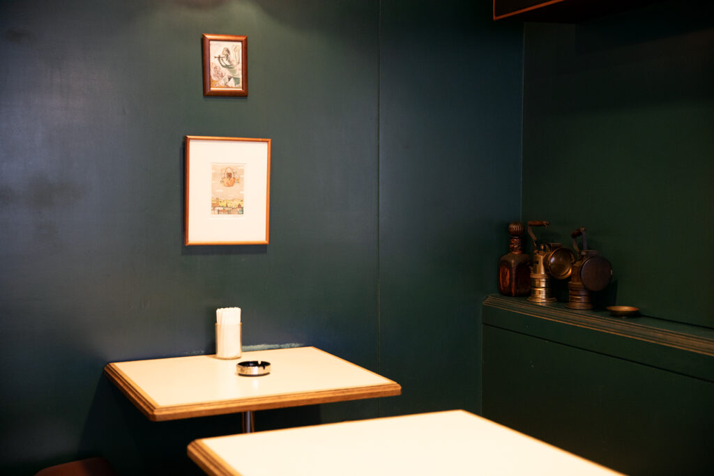 深いグリーンの壁には、あちこちにアート作品が掲げられています