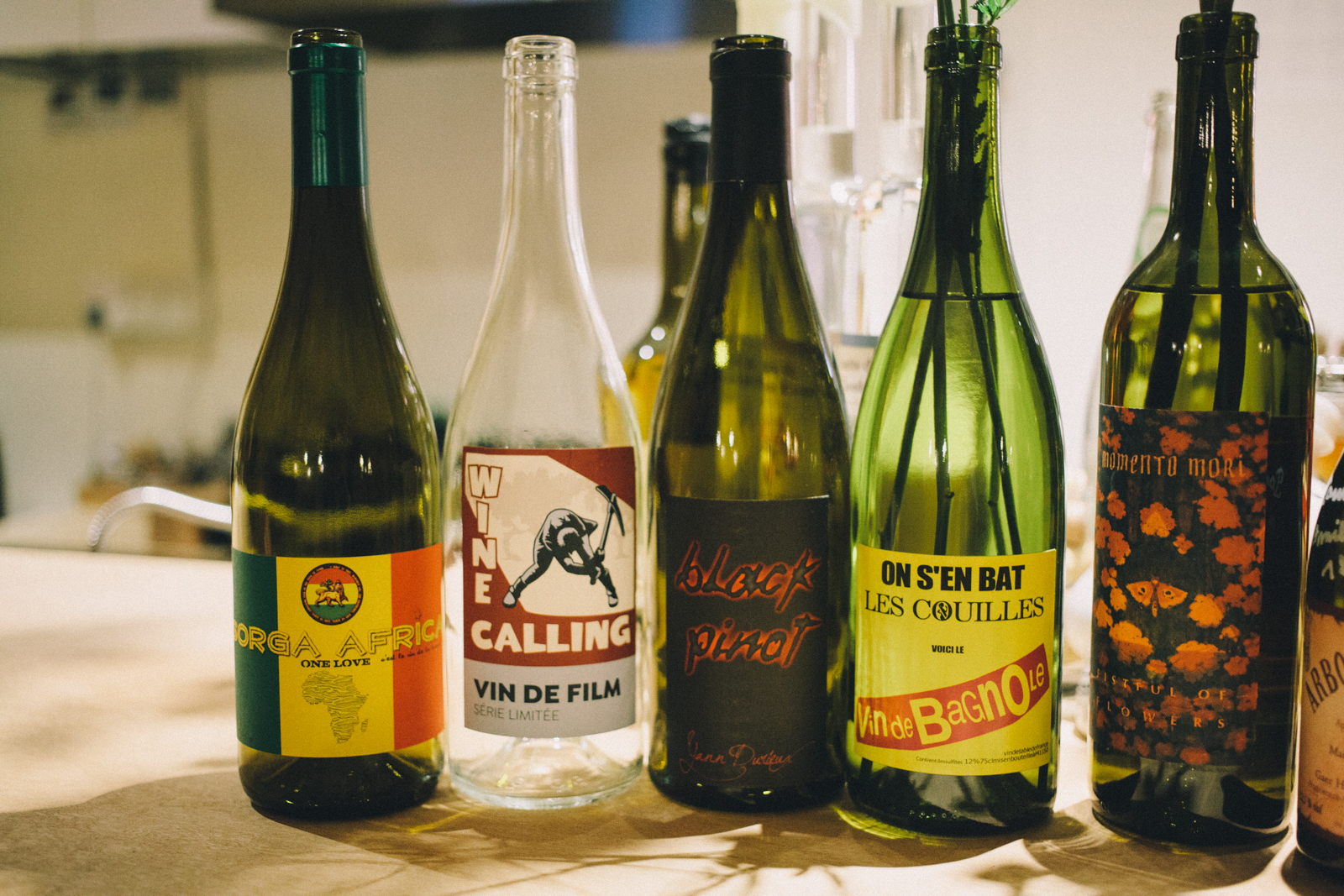 ディスプレイとして、音楽とつながりのあるワインボトルもカウンターにさりげなく配置。セックス・ピストルズやクラッシュ、ダフト・パンク風のラベルデザイン。「『WINE CALLING』はワインの生産者に焦点を当てたドキュメンタリーで、ステッカーをいただいたので貼ってみました」と健光さん。