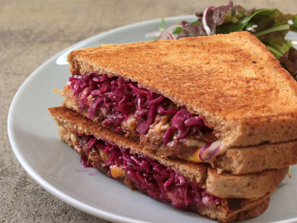 プルドポークサンドは、鮮やかな紫キャベツのマリネなど具沢山でヘルシー。