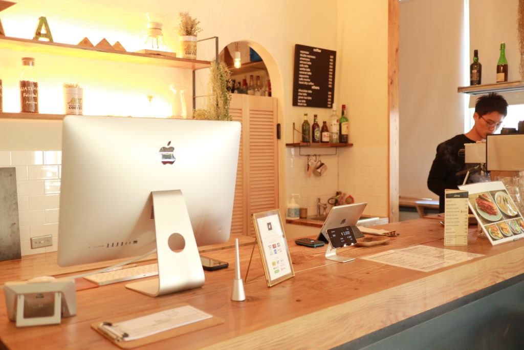 木製のカウンターとiMacが調和する、レセプション兼カフェのレジカウンター。