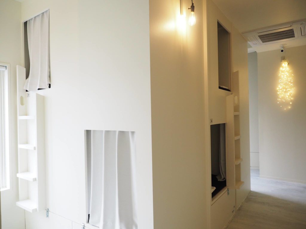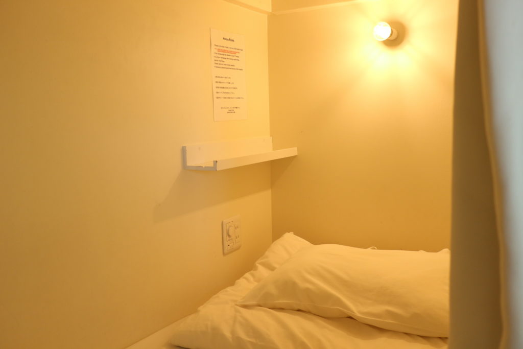 白い壁で区切られた各小部屋には、調光付きライトと充電コンセントも設置されていて、1ベッドにつき1つの鍵付き収納ボックスもあり荷物問題もクリア。さらに小さな棚やハンガーフックもあり、狭くても機能的なつくりに。