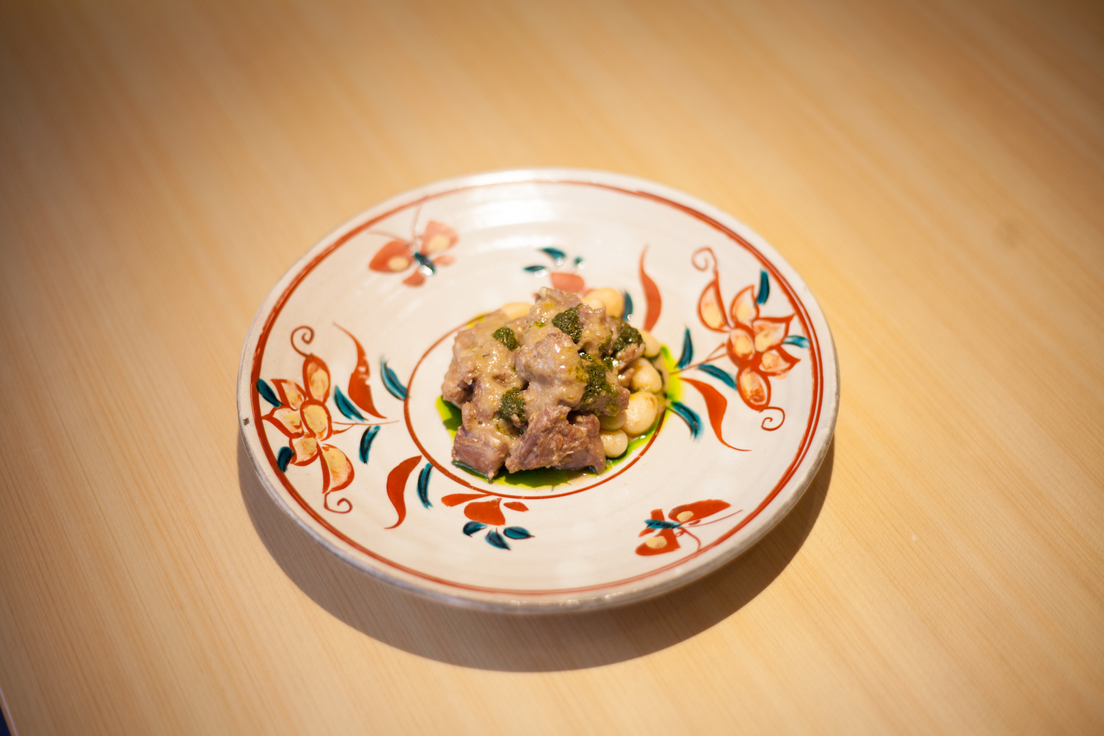 仔羊の肩肉の煮込みは、シチリア地方にあるラパニという町で用いられる、アーモンドペーストとバジリコ、トマトを使ったペーストと共に煮込んだもの。やわらかい肩肉に加え、豆にも羊の旨味が染みわたり、バジリコのさわやかな口の中をかけぬける一皿。羊特有の臭みも全くない。