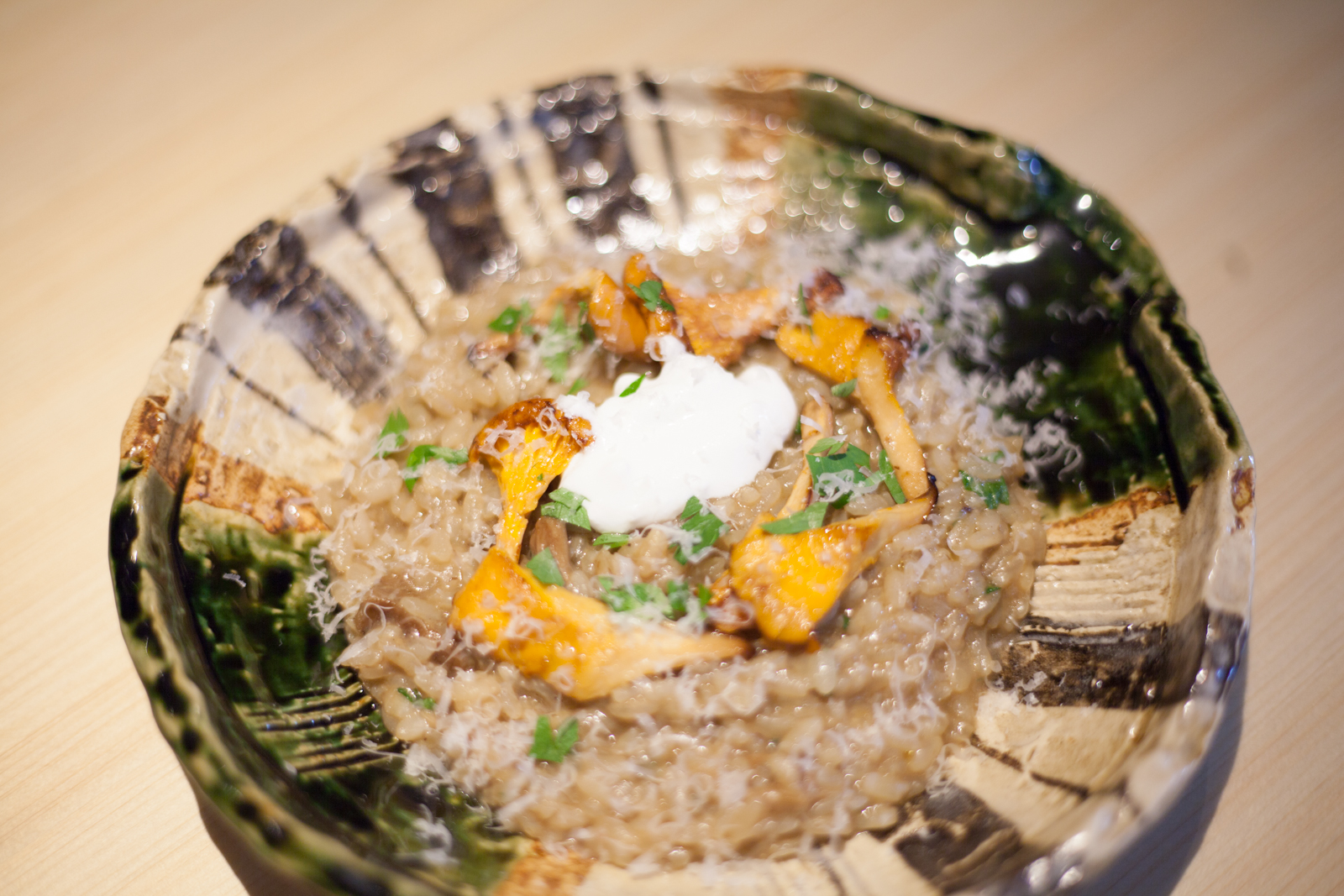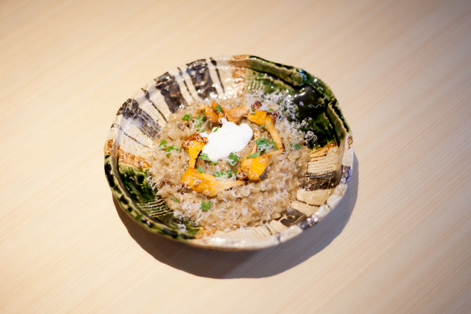 旨味たっぷりのポルチーニとお米を炊き上げ、焼き上げたアンズ茸(別名:ジロール茸)を一緒に混ぜ合わせたリゾット。仕上げに、福岡・大牟田でつくられるフロマージュブラン(酸味のあるフレッシュチーズ)をあわせ、旨味と酸味のハーモニーを奏でる。同様の国産マスカルポーネチーズをつかったティラミスも人気。