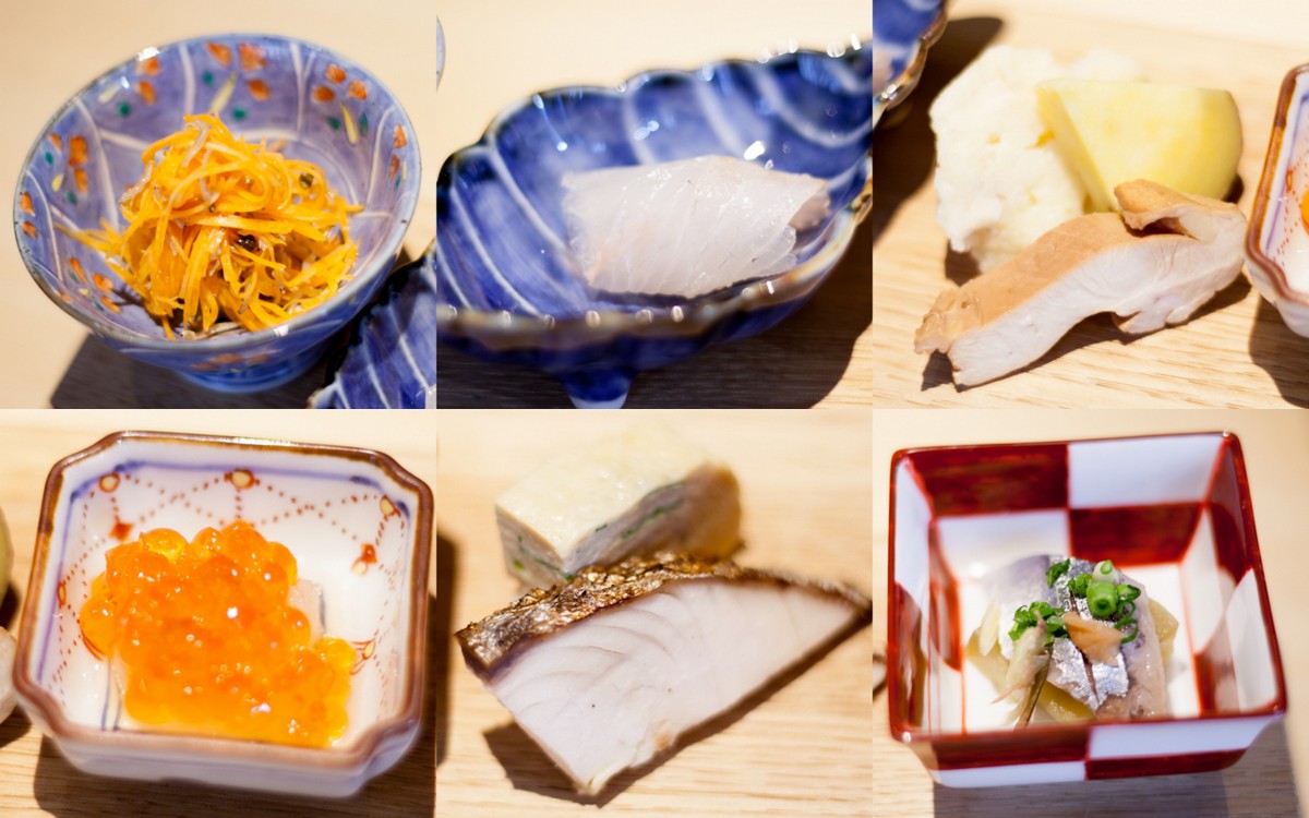 おまかせ 前菜 盛り合わせ ¥2,500 (左から:人参とちりめん山椒をつかったサラダ/天然の鮃 / 鳥取産地鶏の胸肉をつかったハム(写真手前)さつまいものマリネと鯖入りのポテトサラダ(写真奥) / いくらの西京味噌漬け/ 鰆の西京焼き(写真手前)江戸前の煮穴子と平賀有精卵のだしまき(写真奥)/締めサンマと那須のマリネ