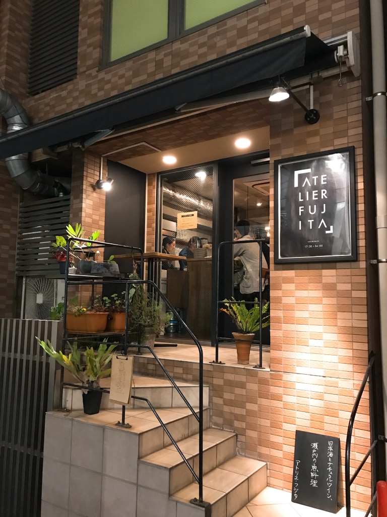 メゾンサンカントサンクからさらにまた駅近、線路沿いに歩き石井珈琲の看板の右手の小道をはいるとすぐの「Atelier Fujita(アトリエフジタ)」。こちらは、自然派ワインと日本酒、そしてオーナー藤田善平さんの地元である瀬戸内の魚介を使ったお料理がいただけます。