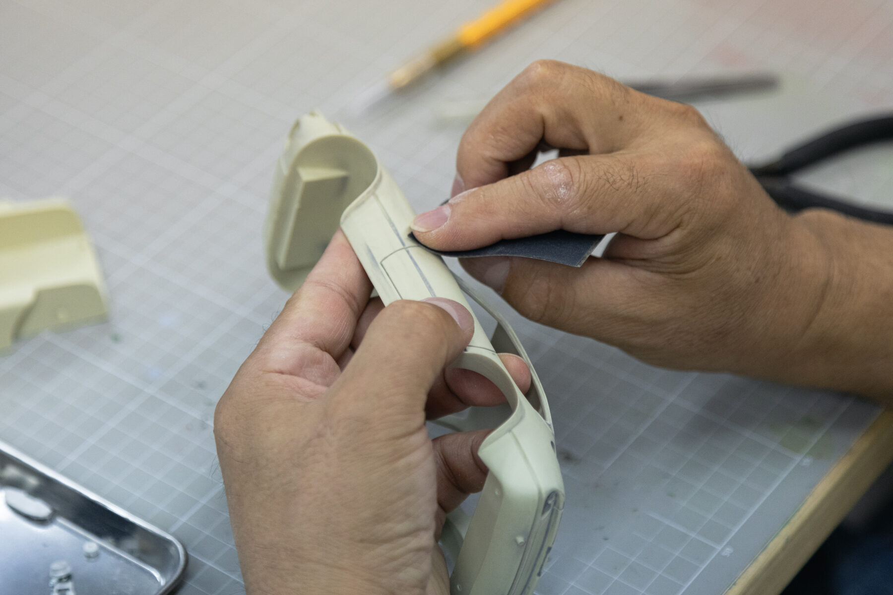 目指すのは、ただ光るのではない。照明や景色が歪みなく、まっすぐに映り込む「鏡面」のような仕上がりだ。ボディのパネルラインをまたいでも、光の線が一直線に流れていく。その完璧な平滑さが生まれたとき、プラスチックの塊は、まるで本物の金属のような輝きと質感を放つのだ。