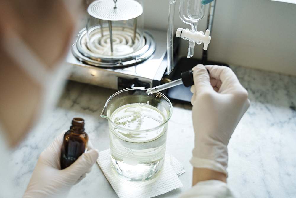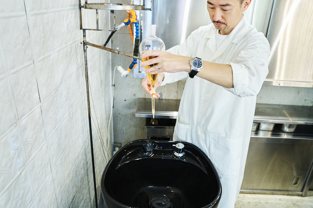 そうして集めたハーブは、「ファクトリー」に備えられた“Alembic(アランビック)”と呼ばれる単式蒸留器で日々蒸留し、エッセンシャルオイルとフローラルウォーターに精製。数にして70種類以上。このエッセンシャルオイルとフローラルウォーターを用い、「ラボ」にてシャンプーやトリートメントをはじめとする、サロンのためのプロダクトの開発・製造が行われている。