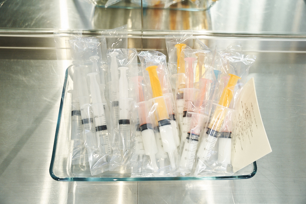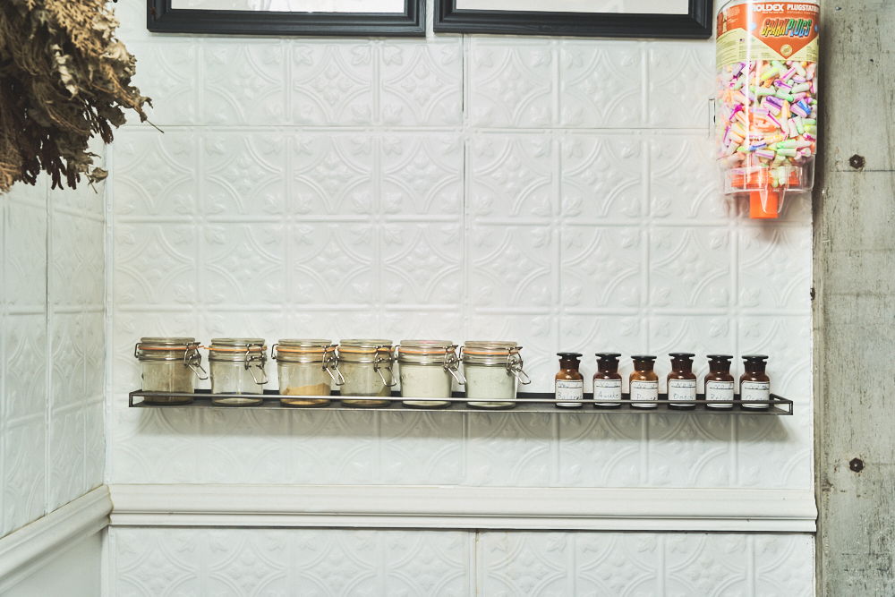 日々仕込んで一回分ずつシリンジにセットされる生シャンプー、トリートメント。ちなみに月替わりの香りに関しては、これまでに同じブレンド(同じ香りのリピート)のものを打ち出したことはないそうで、常連さんは毎月、新しく生み出されたフレッシュな香りを楽しみにしている人も多いそう。