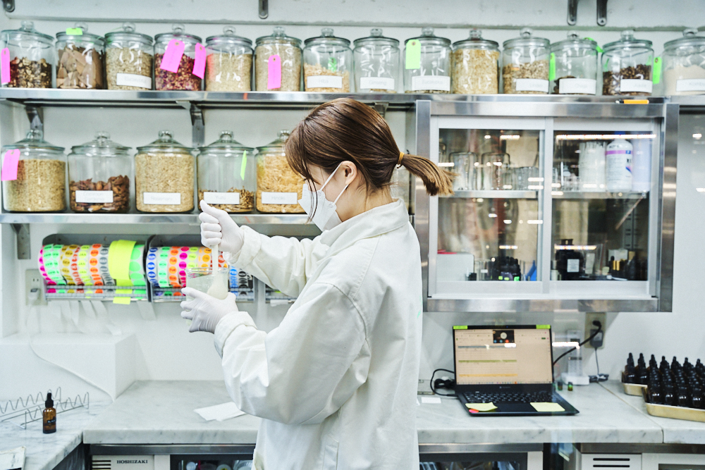 その仕事は、フィールドワークからスタート。ハーブの薬効を美容に生かしたいという考えから、必要なハーブを生産する農家のリサーチを重ね、国内外の信頼出来る生産者から買付け。生産者から手に入らないものは、スタッフ自ら野山(許可を得ている)に入って季節ごとに収穫をする。コロナ禍も相まって採取に行くことが難しくなったハーブは「ファクトリー」で育てることも始めた。
