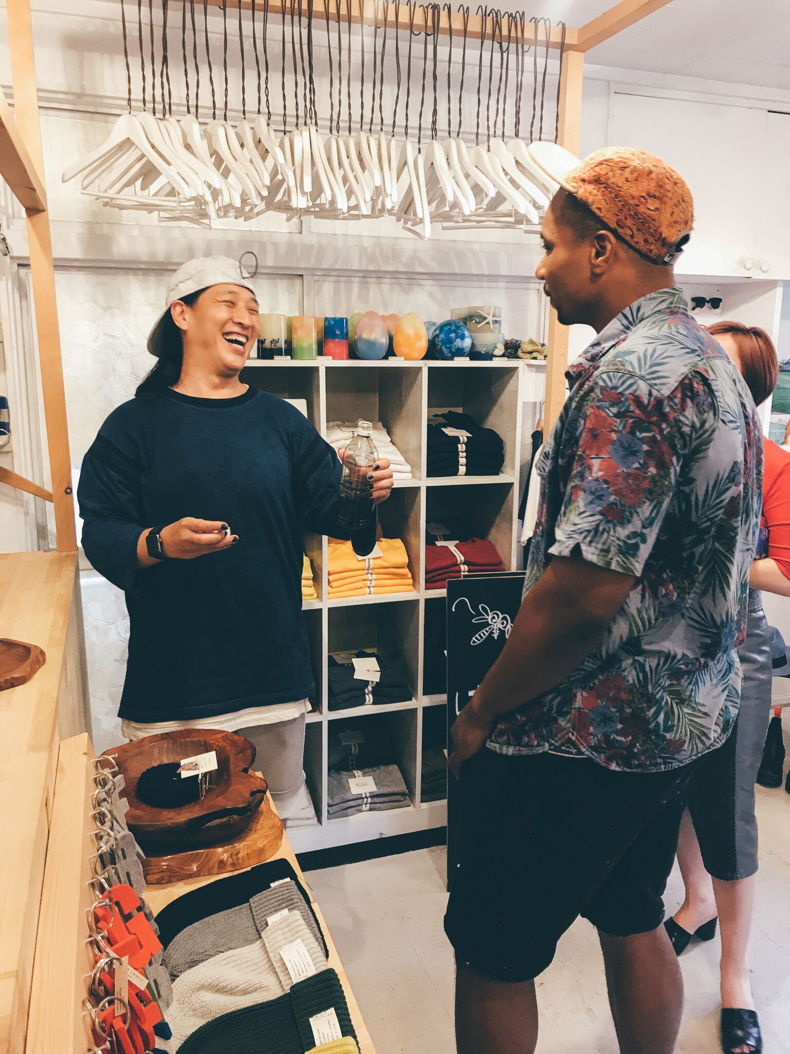 If you’re looking for clothing that’s stylish and has a unique backstory, look no further than Tateisucanna. Many months before our trip, Khari had watched a YouTube video highlighting indigo, and learned of a special blue dye called Aizome, often referred to as “Japan Blue”. With an interest in fashion, he remembered the video while we were in Yoyogi-Uehara(代々木上原) and mentioned the dye to Naoki. To our surprise, Naoki knew one of two Tokyo Aizome designers, who also happened to have a shop in the neighborhood. We walked into Tateisucanna the next day, drawn immediately to a rack of striking blue, casual clothing. Before touching anything, the quality was obvious. Fortunately, the company’s CEO, designer, and Aizenist, Ichiran Toba was there. He greeted us with a smile and blue-stained fingernails. Thanks to Nao translating, Khari was able to speak with him, explaining his interest as Ichiran proudly detailed more about the natural dye’s harvesting process, confirming its rarity and significance to Japanese culture. Truly, an art form! We left with an Aizome shirt for Khari, a deeper admiration for Ichiran’s work, and an invitation to witness the dying process next time we’re in Japan.