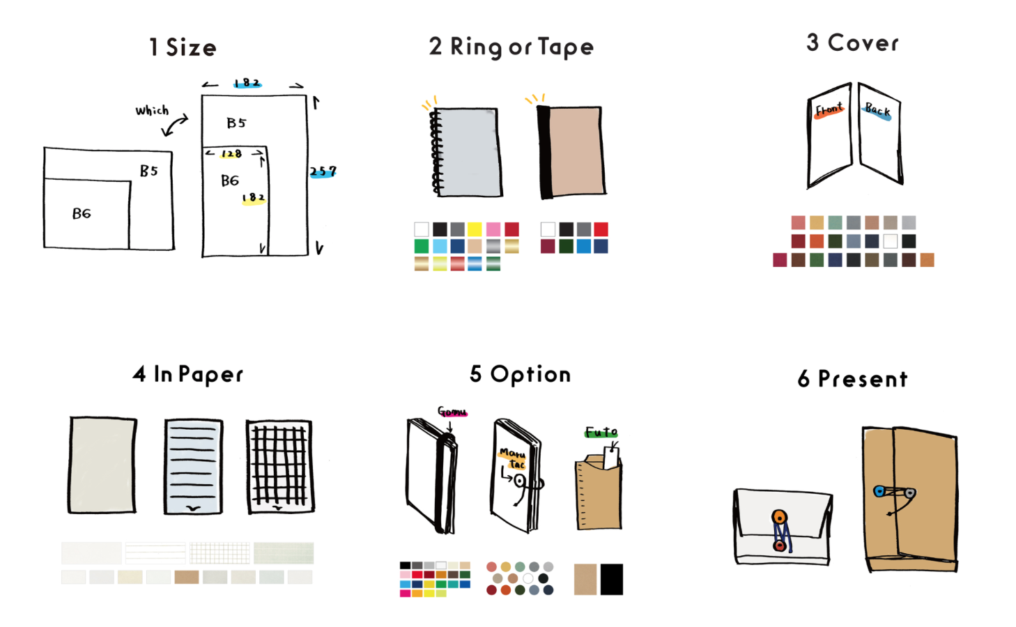 表紙は40種類以上、本文の紙の種類は6種類、リング製本かテープ製本を選べて、ゴムバンドや丸タックをつけれたり、封筒をつけれたり、作成できるノートのバリエーションは総計10万通り以上!