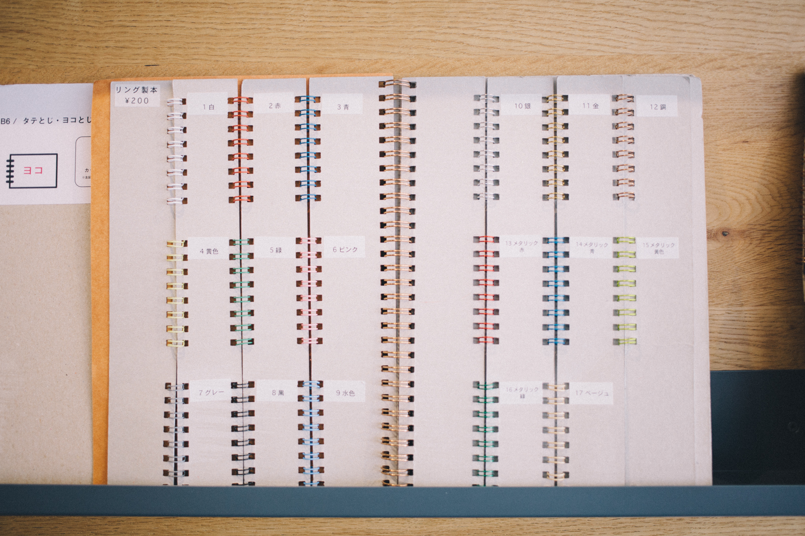 綴じ方はリングかテープの2択で、リングは17種類、テープは8種類から選ぶことができます。すべての工程で、見本の現物をみることができるので、実際に手にとって、選んでいくと良いです。