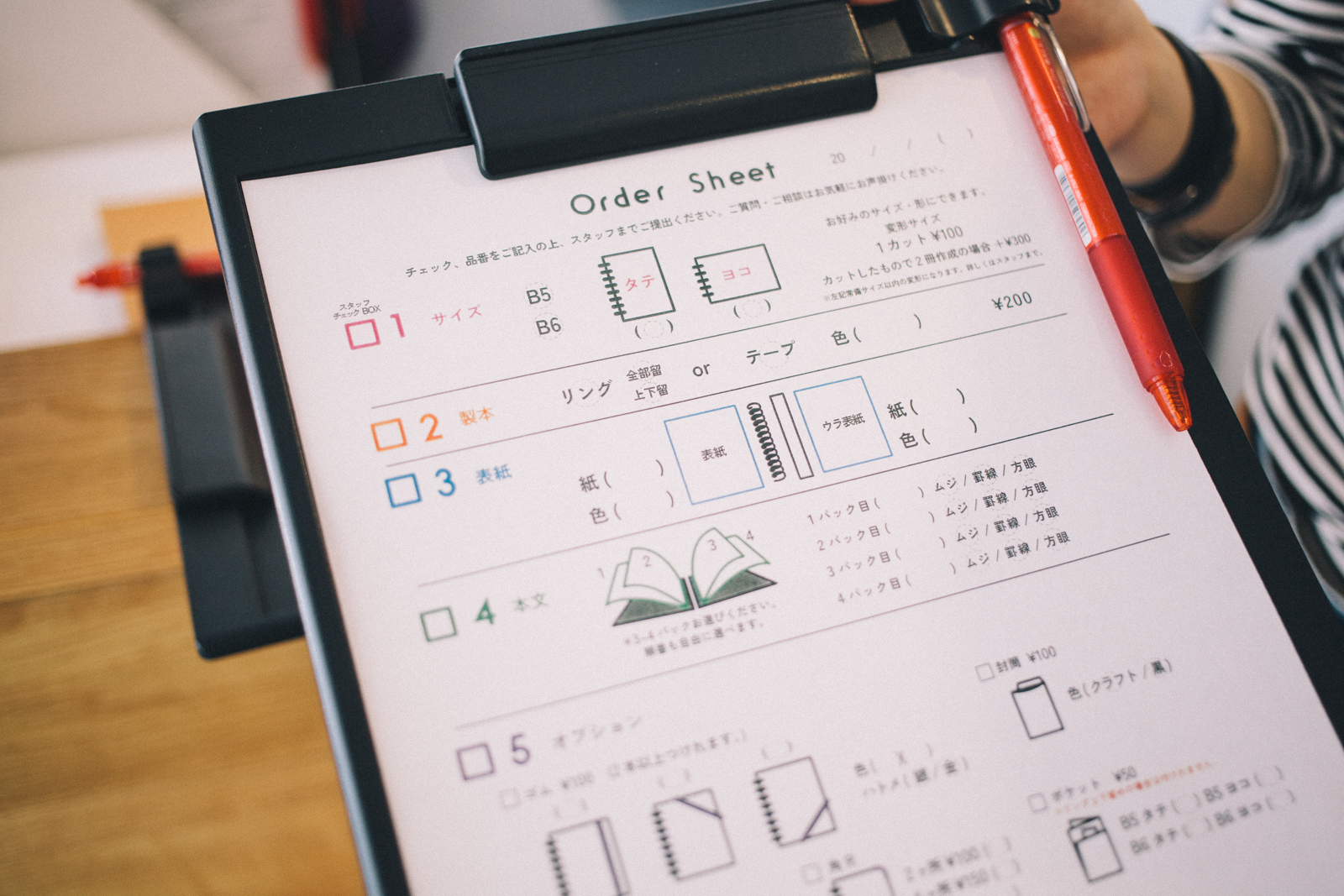 こちらのオーダーシートに、1項目ずつ記載していきます。選ぶ順番や選択肢が1枚の紙になっており大変わかりやすいです。