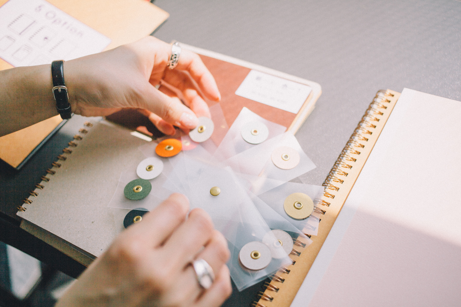 既製品のノートではあまりみられない丸タック。ゴムに比べると、ノートの開閉に少し手間がかかるのですが、人に開かれたくない、日記帳などにはうってつけです。丸タックは15種類から選べて、留め具は金と銀の2種類。