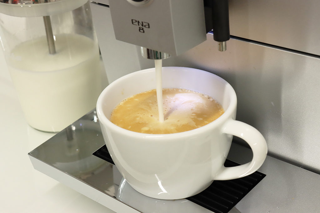 Step 3. コーヒーに続いて、キメ細かく滑らかなミルクフォームが組み合わさっていきます。