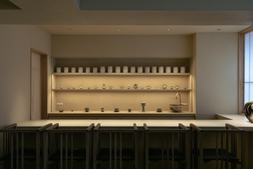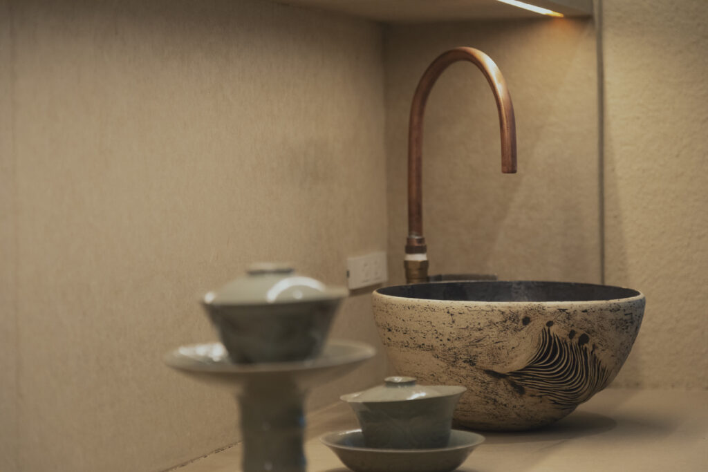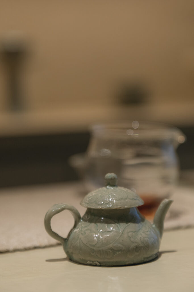 きゅっと縮まった茶葉は、お湯を注いだ茶壺(“チャフウ”と読む、急須)の中でゆっくりと広がり、味や香りが抽出されていく。この空間で過ごしていると、所作のひとつひとつ、香りの変化、沸かした湯の湯気など、普段なら見逃してしまいそうなディテールに気が付く。空間を改めて見返すと、室内のつくりから調度品まで、各所に美しさが溢れていた。
