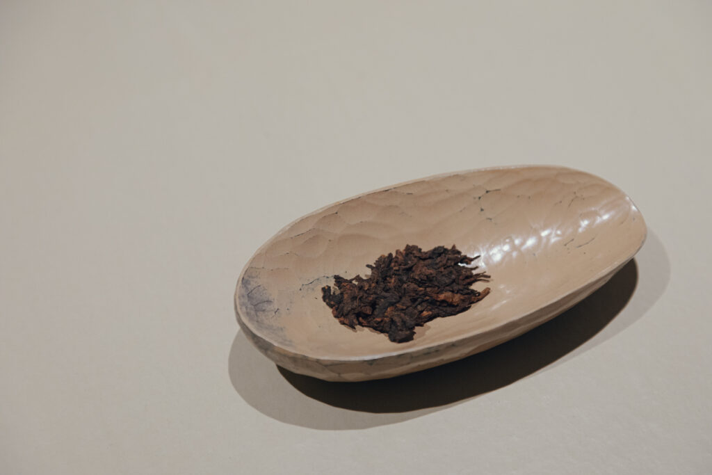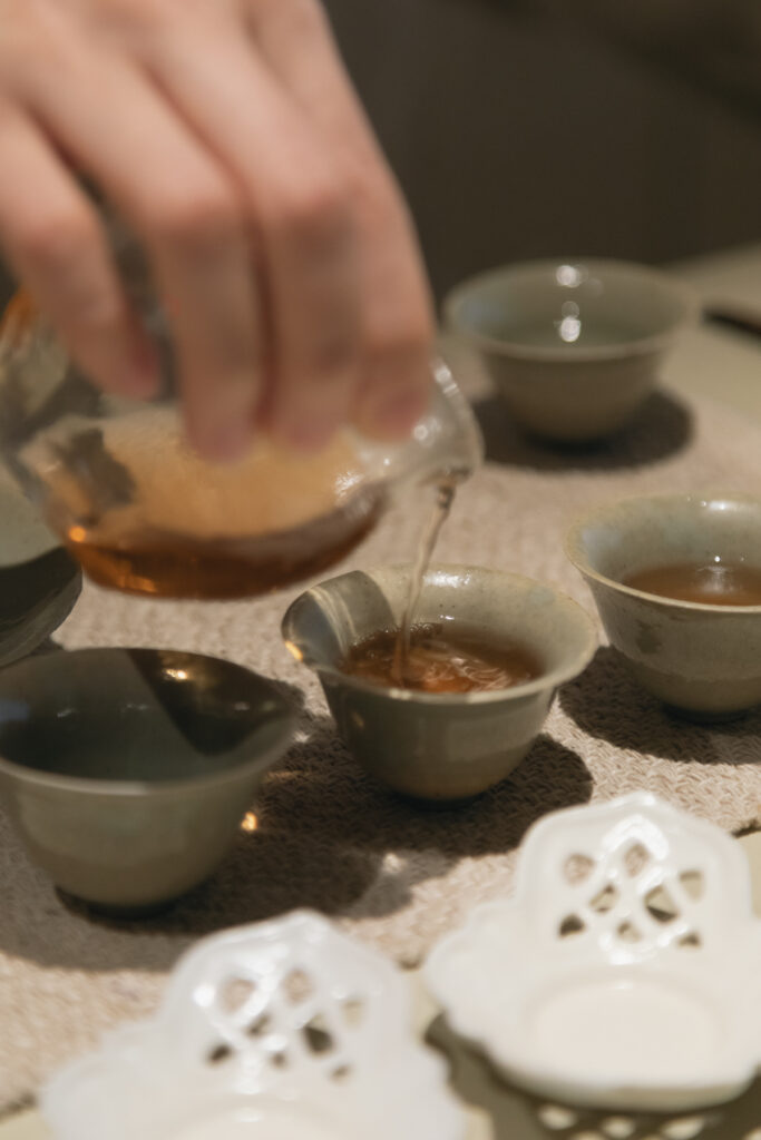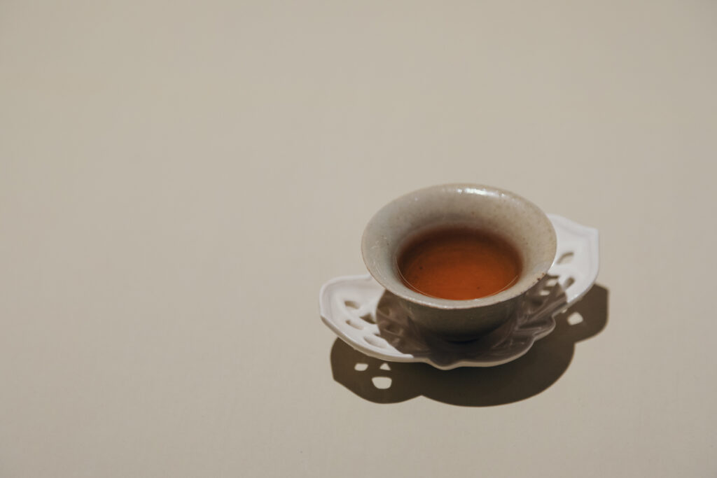 この器は、手のひらにのるくらいのサイズ感。丁寧に淹れていただいた一煎目を撮影させていただく。澄んだ甘い香りも、佇まいも素敵で、誰に言われなくとも大切に味わってみたくなる。「考えるな、感じろ」という言葉があるけれど、“お茶と向き合うこと”は、まさにそんな感じ。淹れていただいた「プーアル熟茶・雲南臨滄」は、なつめのような甘い余韻が印象的で、身体がじわじわと温まるような、滋味深い味わいのお茶。私たちが普段口にする中国茶とは少し異なる味ながらも、どこか懐かしく、すっと心身に馴染むフレーバーだ。
