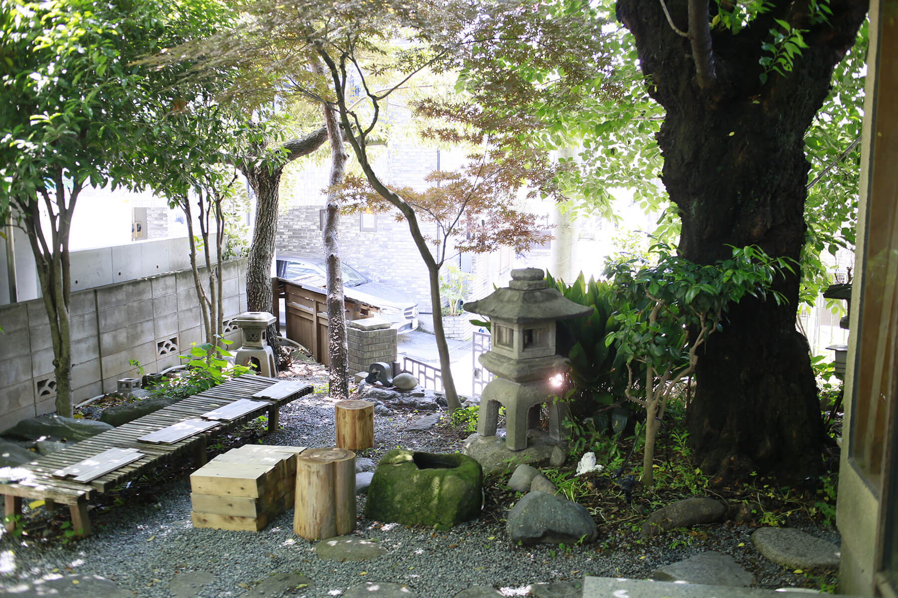 門からアプローチを登ると、立派な玄関がお目見え。そのまま玄関横の飛石を進むと、木漏れ日が美しい庭が現れます。砂利が敷かれ、灯籠が建つ庭には木のベンチや椅子が並び、奥には解放感あるガラス張りのカウンター。そこからコーヒーが提供されています。この場所を表現するなら、「とにかく気持ちがいい」。その一言に尽きるような気がします。