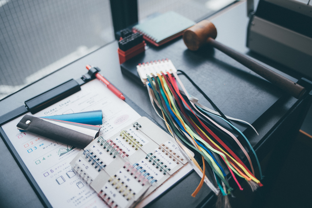 慣れた手つきの穴田さんがオーダーシートをもとに、カラフルな用紙の本棚からまるで調合師のように用紙を抜き出し、Naoさんが選んだ裏表紙、リング、バインダー、用紙をするすると組み合わせていく。