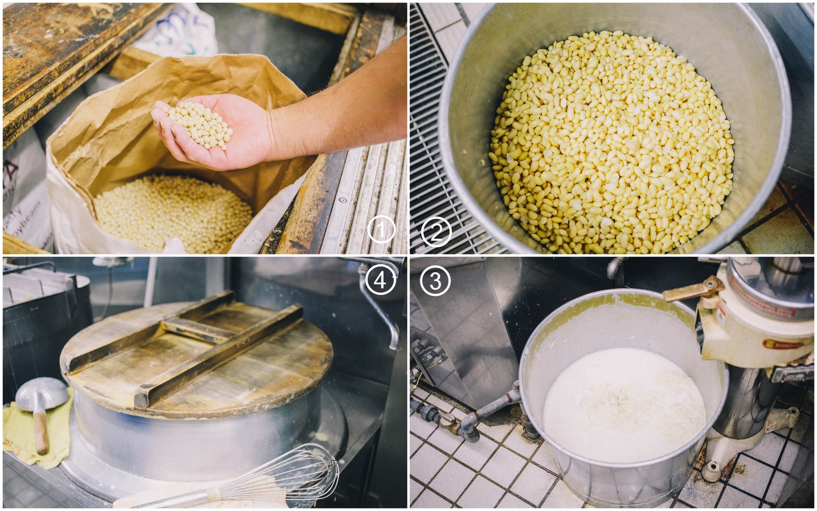 ①こちらが原料の大豆→②前日に、次の日つくる分に必要な大豆を一晩水に漬け込みます。翌日に売り切るだけの量をここで見極める必要があり、経験と勘が必要なポイント→③水とあわせて、大豆を粉砕します→④水と大豆が混ざった汁(生呉)を窯でグツグツ煮込みます。太田屋豆腐店は昔ながらの、地釜で煮込むスタイル