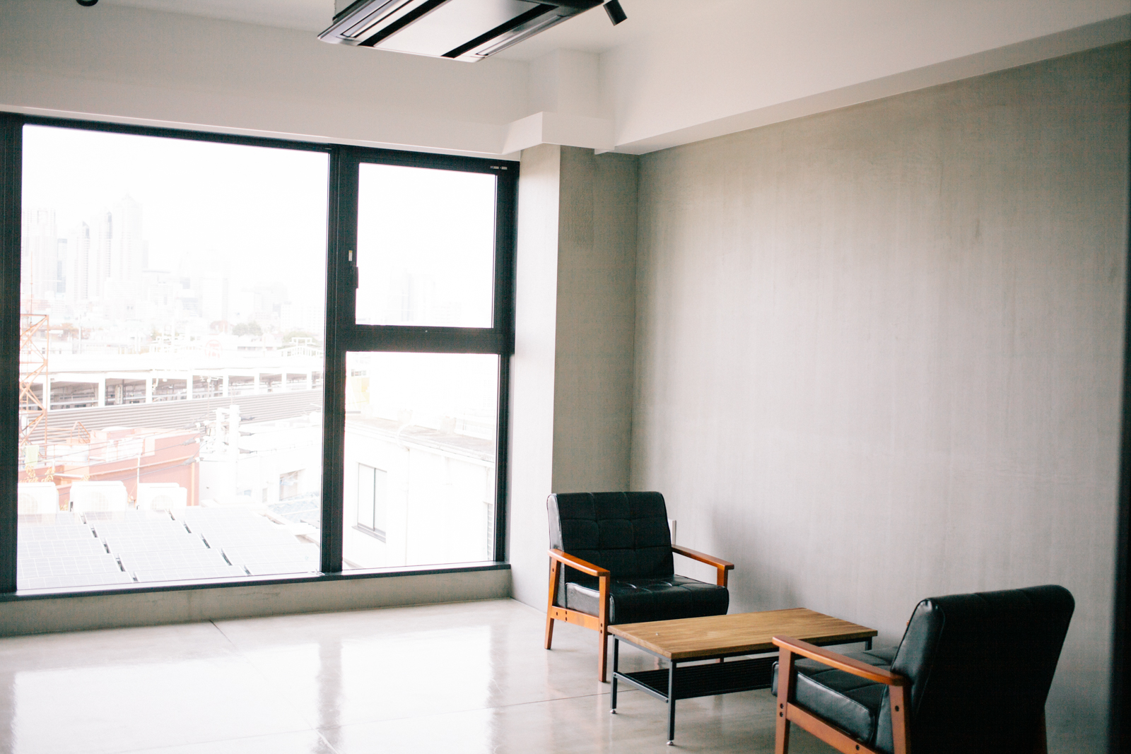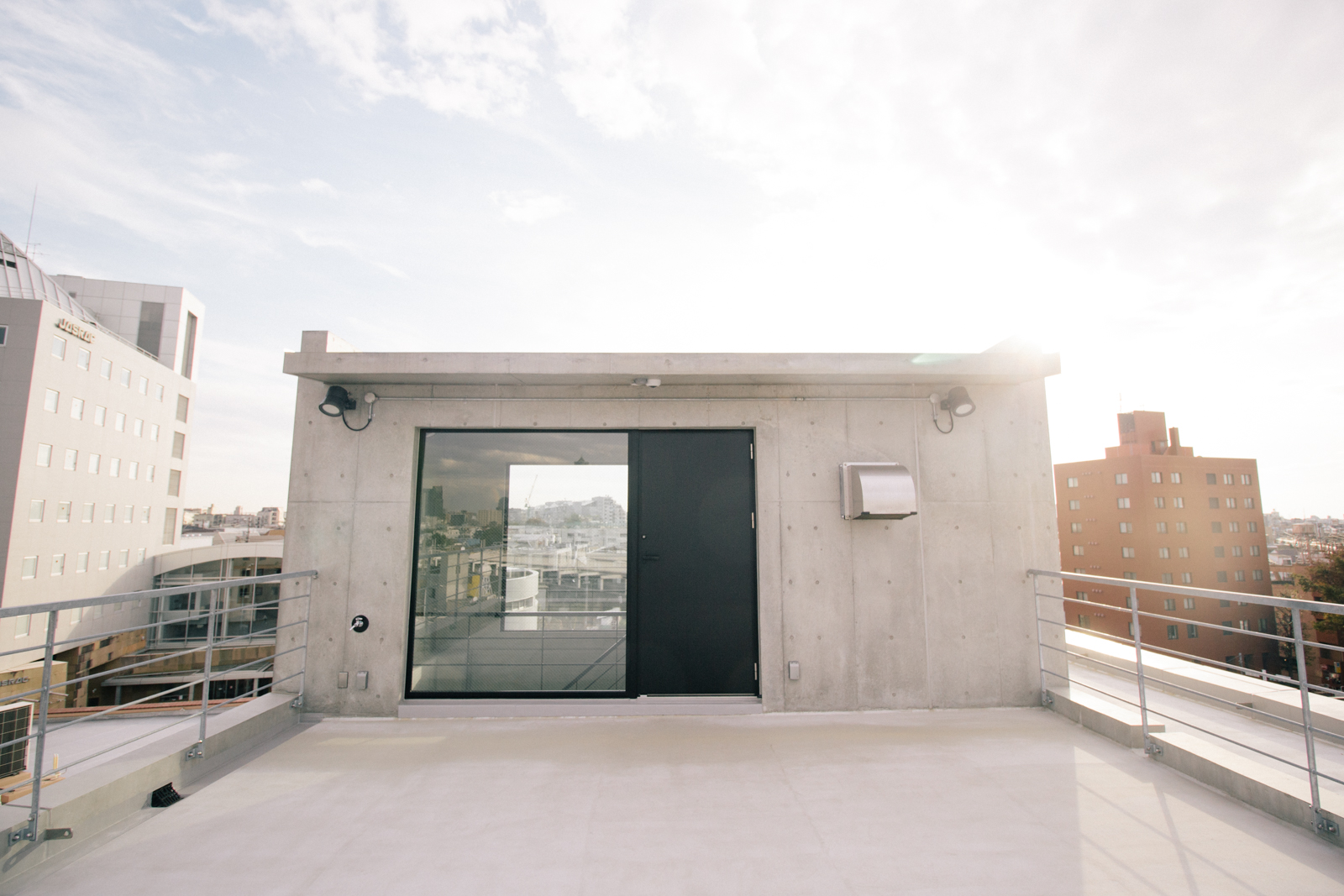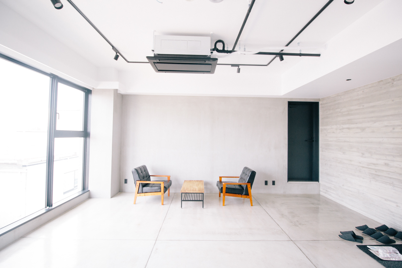 屋上のひとつ下の階は、インダストリアル&ミニマルなスペース。撮影スタジオのほか、メイクスペース、バルコニー、トイレやシャワールームなども備えておりロケ撮影の控え室等にも良い。