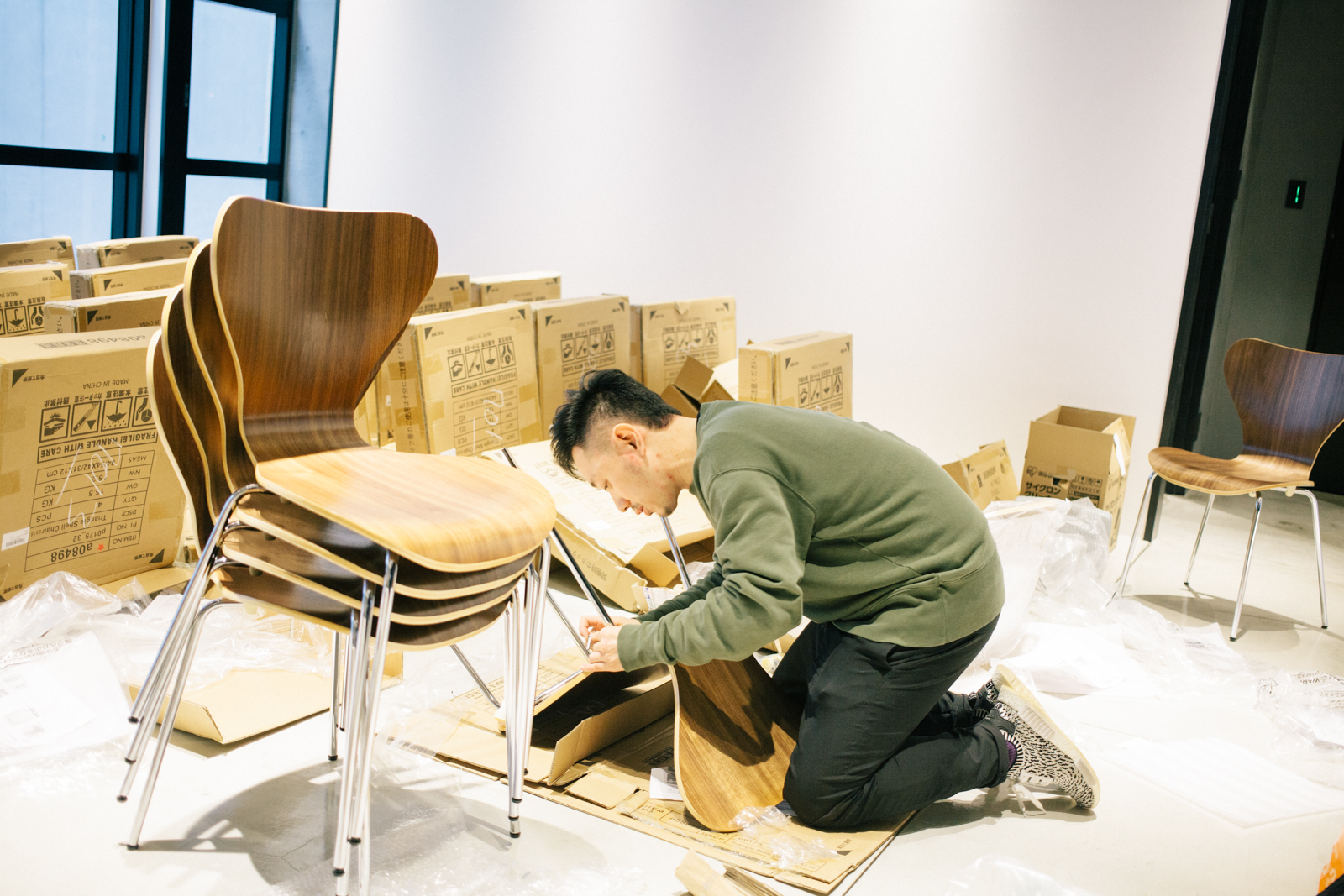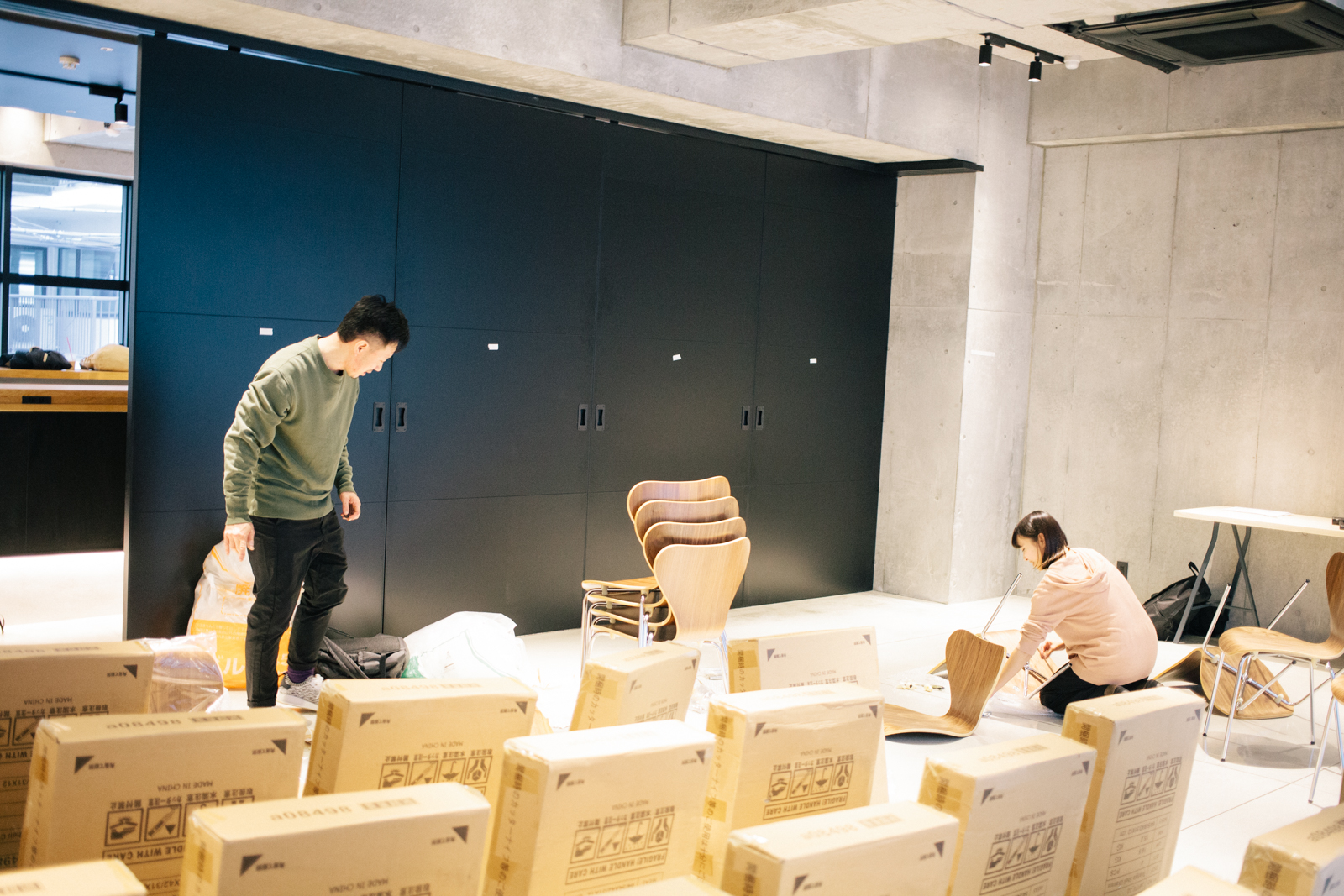 LIFESOUND 社員のみなさん(山内さん含む)で100脚近くコツコツ組み立てていました。