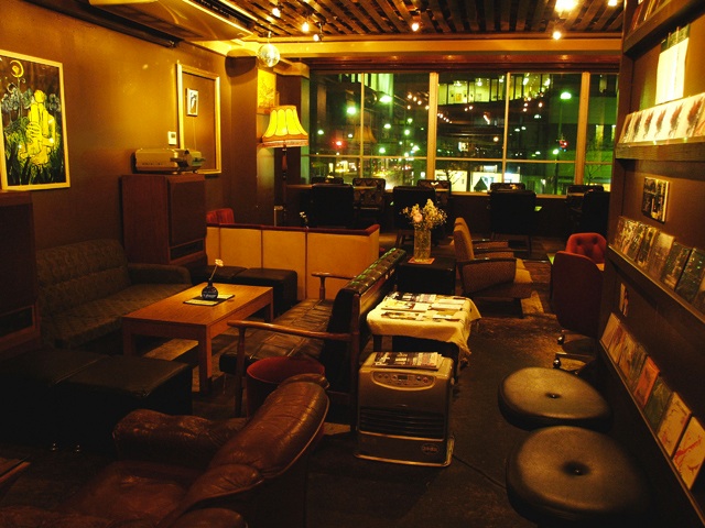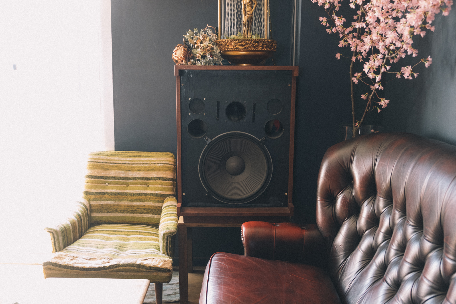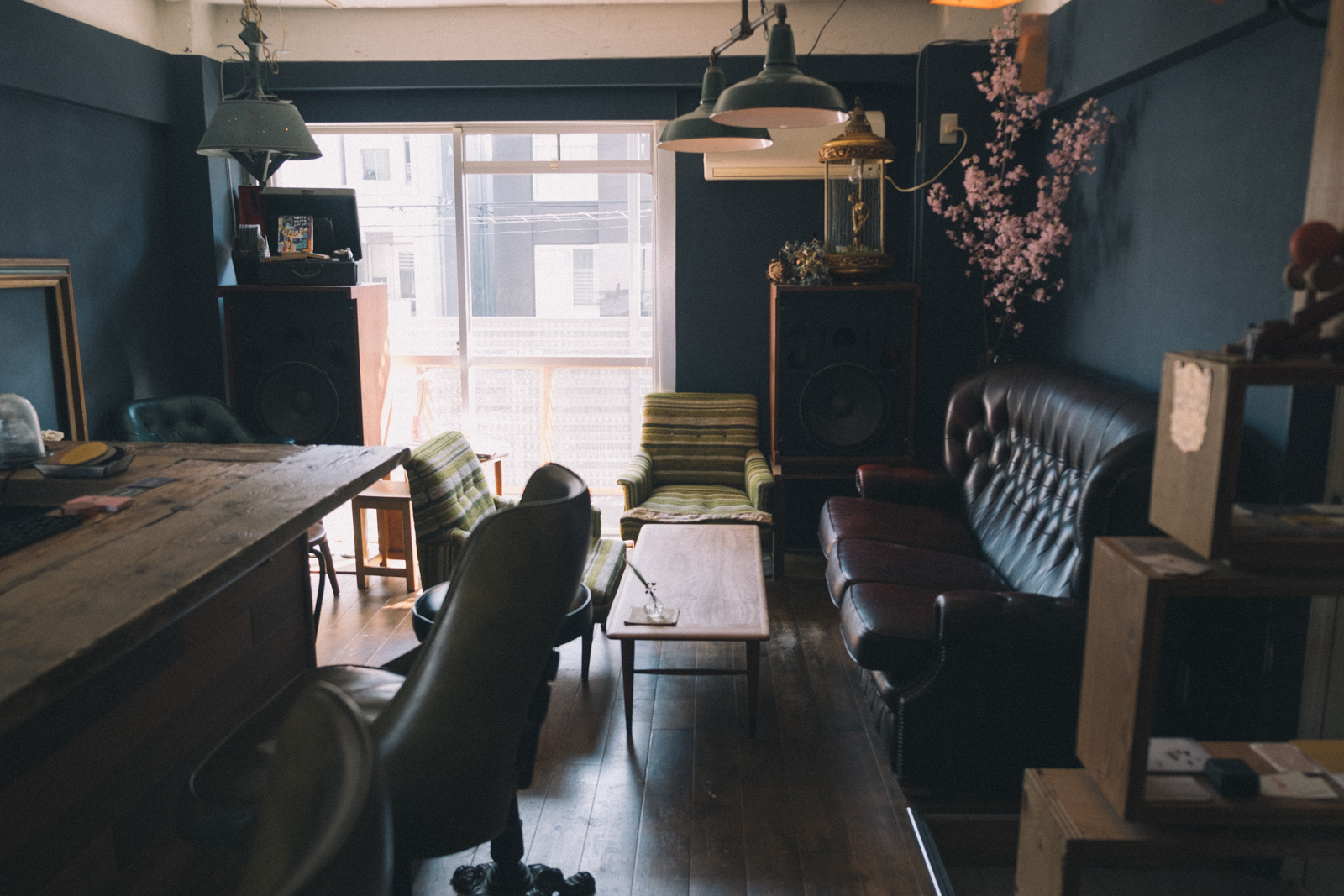 ドアをあけると、アンティークの家具や古くて大きなスピーカーが並ぶ、外観からは想像のつかない空間がひろがっています。