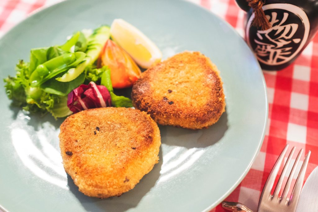 紅ずわい蟹をふんだんに使った「カニクリームコロッケ」は、なんとおにぎり型。油で揚げずにバターで焼き上げるこだわりも。