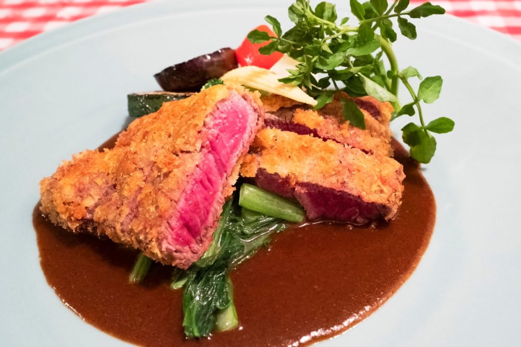 A5ランクの宮崎牛特選牛を使った「ビーフカツレツ」は、最も美味しく食べられる焼き加減で柔らか。